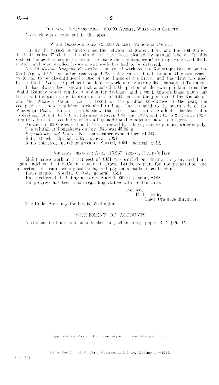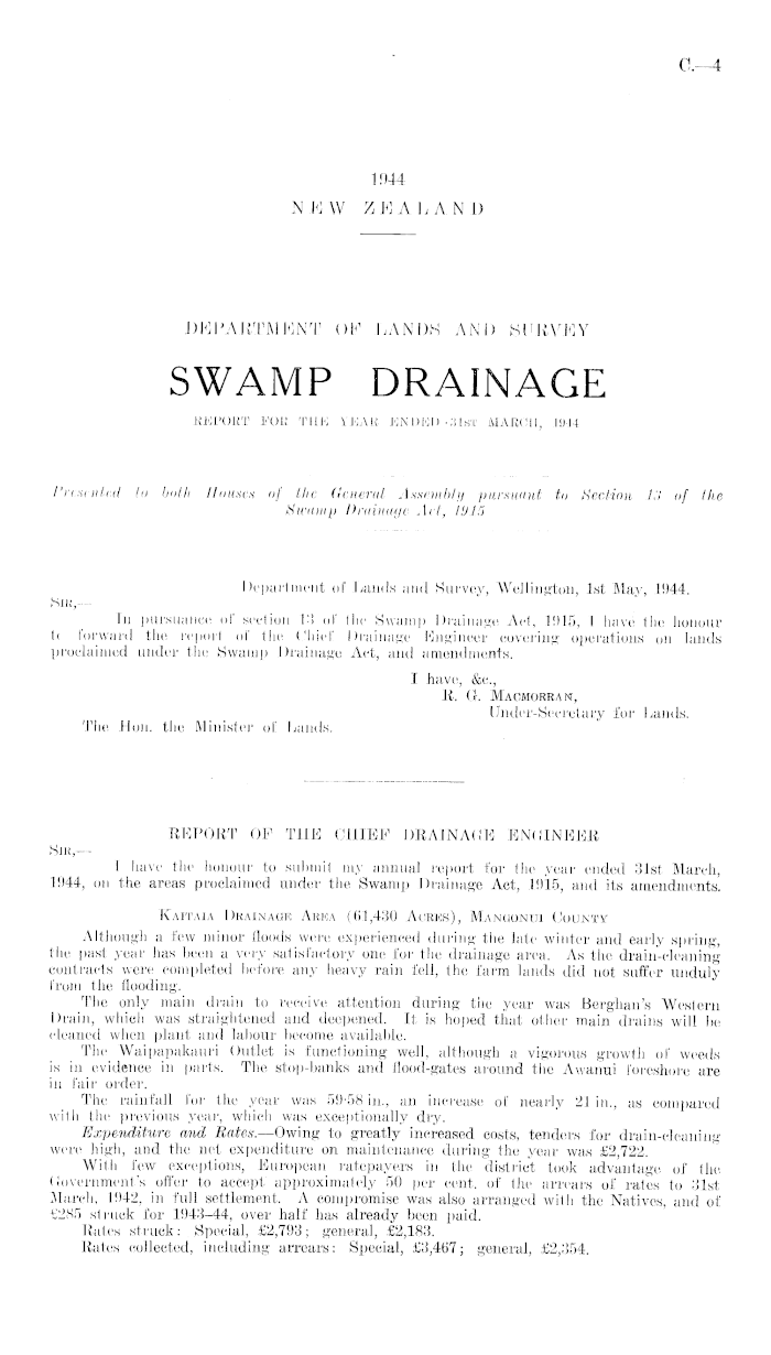 DEPARTMENT OF LANDS AND SURVEY SWAMP DRAINAGE REPORT FOR THE YEAR ENDED 31st MARCH, 1944, Appendix to the Journals of the House of Representatives, 1944 Session I, C-04