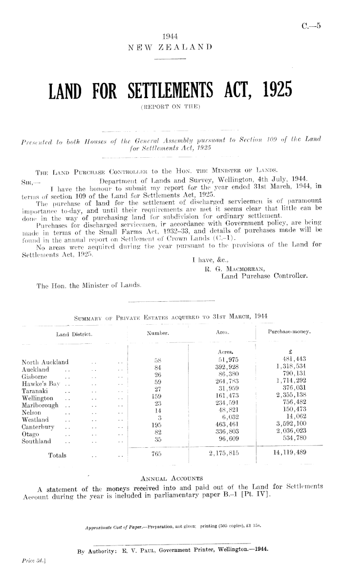308LAND FOR SETTLEMENTS ACT, 1925 (REPORT ON THE) Appendix to the Journals of the House of Representatives, 1944 Session I, C-05