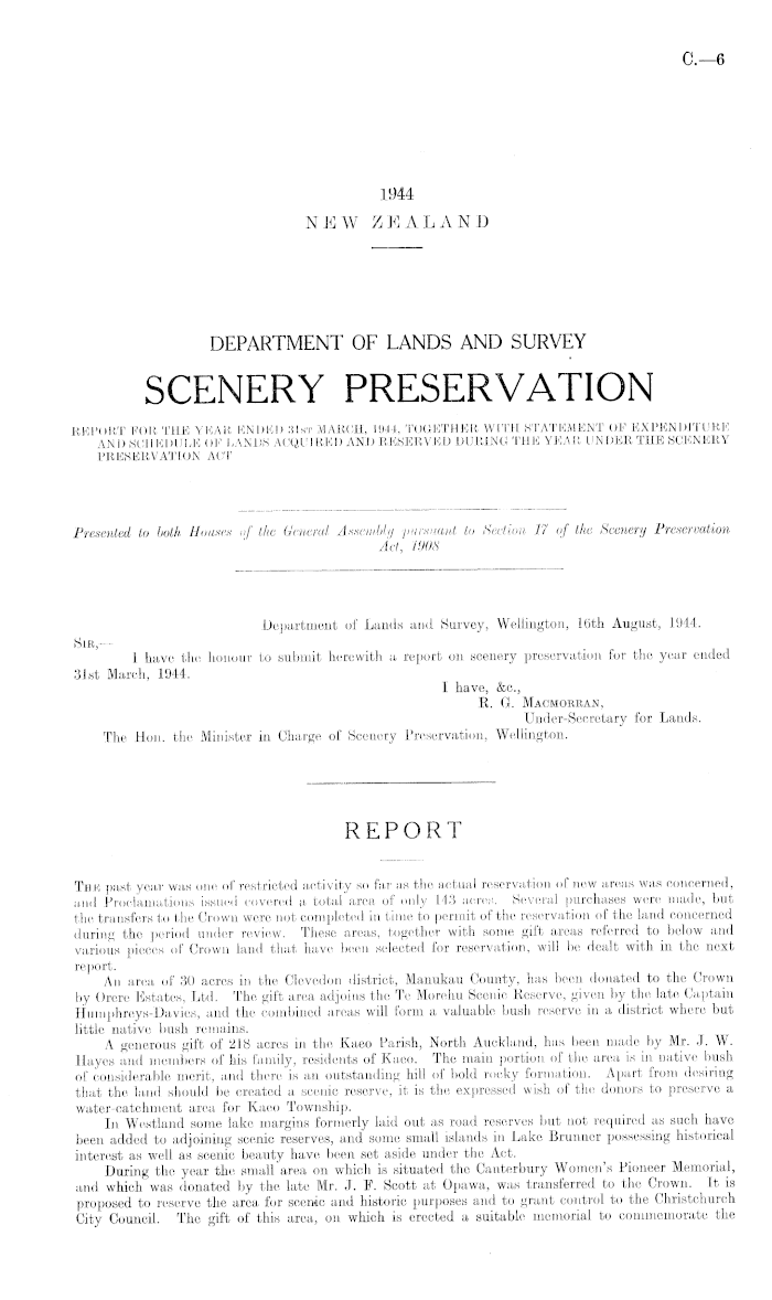 Department of Lands and Survey, Wellington, 16th August, 1944. Sir, — I have the honour to submit herewith a report on scenery preservation for the year ended 31st March, 1944. I have, &c., R. G. Macmorran, Under-Secretary for Lands. The Hon. the Minister in Charge of Scenery Preservation, Wellington.