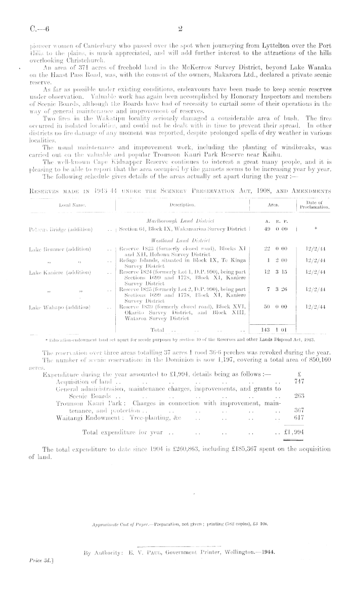 984DEPARTMENT OF LANDS AND SURVEY SCENERY PRESERVATION REPORT FOR THE YEAR ENDED 31st MARCH, 1944, TOGETHER WITH STATEMENT OF EXPENDITURE AND SCHEDULE OF LANDS ACQUIRED AND RESERVED DURING THE YEAR UNDER THE SCENERY PRESERVATION ACT Appendix to the Journals of the House of Representatives, 1944 Session I, C-06
