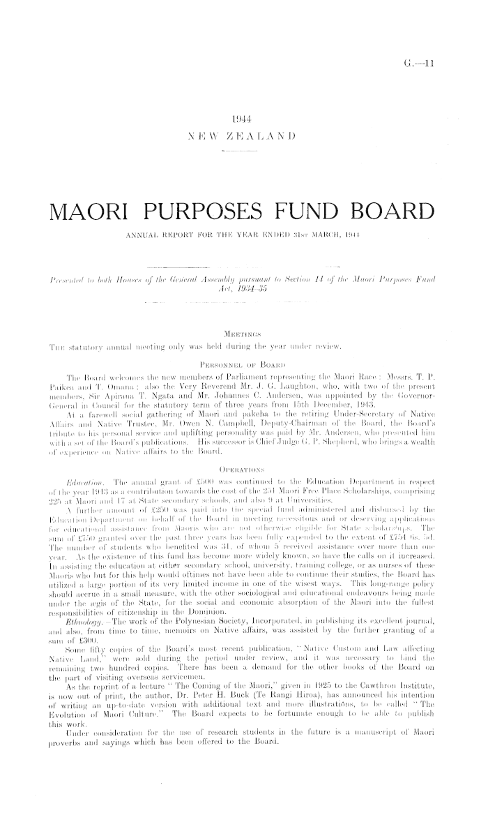Meetings The statutory annual meeting only was held during the year under review. Personnel of Board The Board welcomes the new members of Parliament representing the Maori Race : Messrs. T. P. Paikea and T. Omana ; also the Very Reverend Mr. J. G. Laughton, who, with two of the present members, Sir Apirana T. Ngata and Mr. Johannes C. Andersen, was appointed by the GovernorGeneral in Council for the statutory term of three years from 15th December, 1943. At a farewell social gathering of Maori and pakeha to the retiring Under-Secretary of Native Affairs and Native Trustee, Mr. Owen N. Campbell, Deputy-Chairman of the Board, the Board's tribute to his personal service and uplifting personality was paid by Mr. Andersen, who presented him with a set of the Board's publications. His successor is Chief Judge G. P. Shepherd, who brings a wealth of experience on Native affairs to the Board. Operations Education. —The annual grant of £500 was continued to the Education Department in respect of the year 1943 as a contribution towards the cost of the 251 Maori Free Place Scholarships, comprising 225 at Maori and 17 at State secondary schools, and also 9 at Universities. A further amount of £250 was paid into the special fund administered and disbursed by the Education Department on behalf of the Board in meeting necessitous and/or deserving applications for educational assistance from Maoris who are not otherwise eligible for State scholarships. The sum of £750 granted over the past three years has been fully expended to the extent of £754 6s. sd. The number of students who benefited was 31, of whom 5 received assistance over more than one year. As the existence of this fund has become more widely known, so have the calls on it increased. In assisting the education at either secondary school, university, training college, or as nurses of these Maoris who but for this help would oftimes not have been able to continue their studies, the Board has utilized a large portion of its very limited income in one of the wisest ways. This long-range policy should accrue in a small measure, with the other sociological and educational endeavours being made under the aegis of the State, for the social and economic absorption of the Maori into the fullest responsibilities of citizenship in the Dominion. Ethnology. —The work of the Polynesian Society, Incorporated, in publishing its excellent journal, and also, from time to time, memoirs on Native affairs, was assisted by the further granting of a sum of £300. Some fifty copies of the Board's most recent publication, " Native Custom and Law affecting Native Land," were sold during the period under review, and it was necessary to bind the remaining two hundred copies. There' has been a demand for the other books of the Board on the part of visiting overseas servicemen. As the reprint of a lecture " The Coming of the Maori," given in 1925 to the Cawthron Institute, is now out of print, the author, Dr. Peter H. Buck (Te Rangi Hiroa), has announced his intention of writing an up-to-date version with additional text and more illustrations, to be called " The Evolution of Maori Culture." The Board expects to be fortunate enough to be able to publish this work. Under consideration for the use of research students in the future is a manuscript of Maori proverbs and sayings which has been offered to the Board.