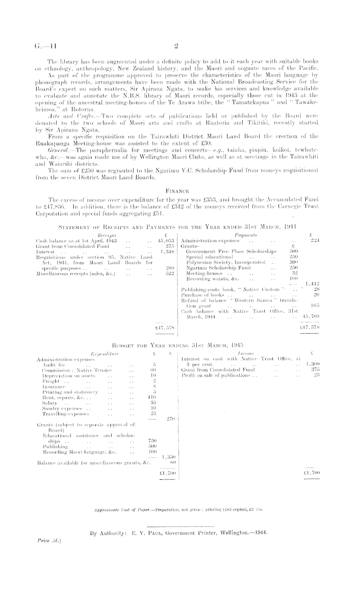 The library has been augmented under a definite policy to add to it each year with suitable books 011 ethnology, anthropology, New Zealand history, and the Maori and cognate races of the Pacific. As part of the programme approved to preserve the characteristics of the Maori language by phonograph records, arrangements have been made with the National Broadcasting Service for the Board's expert on such matters, Sir Apirana Ngata, to make his services and knowledge available to evaluate and annotate the N.B.S. library of Maori records, especially those cut in 1943 at the opening of the ancestral meeting-houses of the Te Arawa tribe, the " Tamatekapua " and " Tawakeheimoa," at Rotorua. Arts and Crafts. —Two complete sets of publications held or published by the Board were donated to the two schools of Maori arts and crafts at Ruatoria and Tikitiki, recently started by Sir Apirana Ngata. From a specific requisition on the Tairawhiti District Maori Land Board the erection of the Ruakapanga Meeting-house was assisted to the extent of £30. General. —The paraphernalia for meetings and concerts —e.g., taiaha, piupiu, koikoi, tewhatewha, &c. —was again made use of by Wellington Maori Clubs, as well as at meetings in the Tairawhiti and Waiariki districts. The sum of £250 was regranted to the Ngarimu V.C. Scholarship Fund from moneys requisitioned from the seven District Maori Land Boards. Finance The excess of income over expenditure for the year was £353, and brought the Accumulated Fund to £47,836. In addition, there is the balance of £342 of the moneys received from the Carnegie Trust Corporation and special funds aggregating £51. Statement of Receipts and Payments foe the Year ended 31st March, 1944 Receipts £ Payments £ Cash balance as at Ist April, 1943 .. .. 45,053 Administration expenses .. .. .. 224 Grant from Consolidated Fund .. . . 375 Grants — £ Interest .. .. .. .. .. 1,348 Government Free Place Scholarships 500 Requisitions under section 95, Native Land Special educational .. .. 250 Act, 1931, from Maori Land Boards for Polynesian Society, Incorporated .. 300 specific purposes .. .. .. .. 280 Ngarimu Scholarship Fund .. 250 Miscellaneous receipts (sales, &c.) .. .. 522 Meeting-houses .. .. .. 32 Recording waiata, &c. .. . . 100 1,432 Publishing-costs book, " Native Custom " .. ' 28 Purchase of books .. .. . . . . 20 Refund of balance " Western Samoa " translation grant . . .. . . .. 105 Cash balance with Native Trust Office, 31st March, 1944 .. .. .. .. 45,709 £47,578 £47,578 Budget for Year ending 31st March, 1945 Expenditure £ £ Income £ Administration expenses — Interest on cash with Native Trust Office, at Audit fee .. .. .. 5 3 per cent. .. . . .. 1,300 Commission: Native Trustee .. 00 Grant from Consolidated Fund .. . . 375 Depreciation on assets .. .. 10 Profit on sale of publications .. .. . . 25 Freight .. .. .. 2 Insurance .. .. .. 8 Printing and stationery .. .. 5 .Rent, repairs, &c. .. .. .. 110 Salary .. .. .. .. 35 Sundry expenses .. .. .. 10 Travelling-expenses .. .. 25 270 Grants (subject to separate approval of Board) — Educational assistance and scholarships .. .. .. .. 750 Publishing .. .. .. 500 Recording Maori language, &c. .. 100 1,350 Balance available for miscellaneous grants, &c. 80 £1,700 £1,700