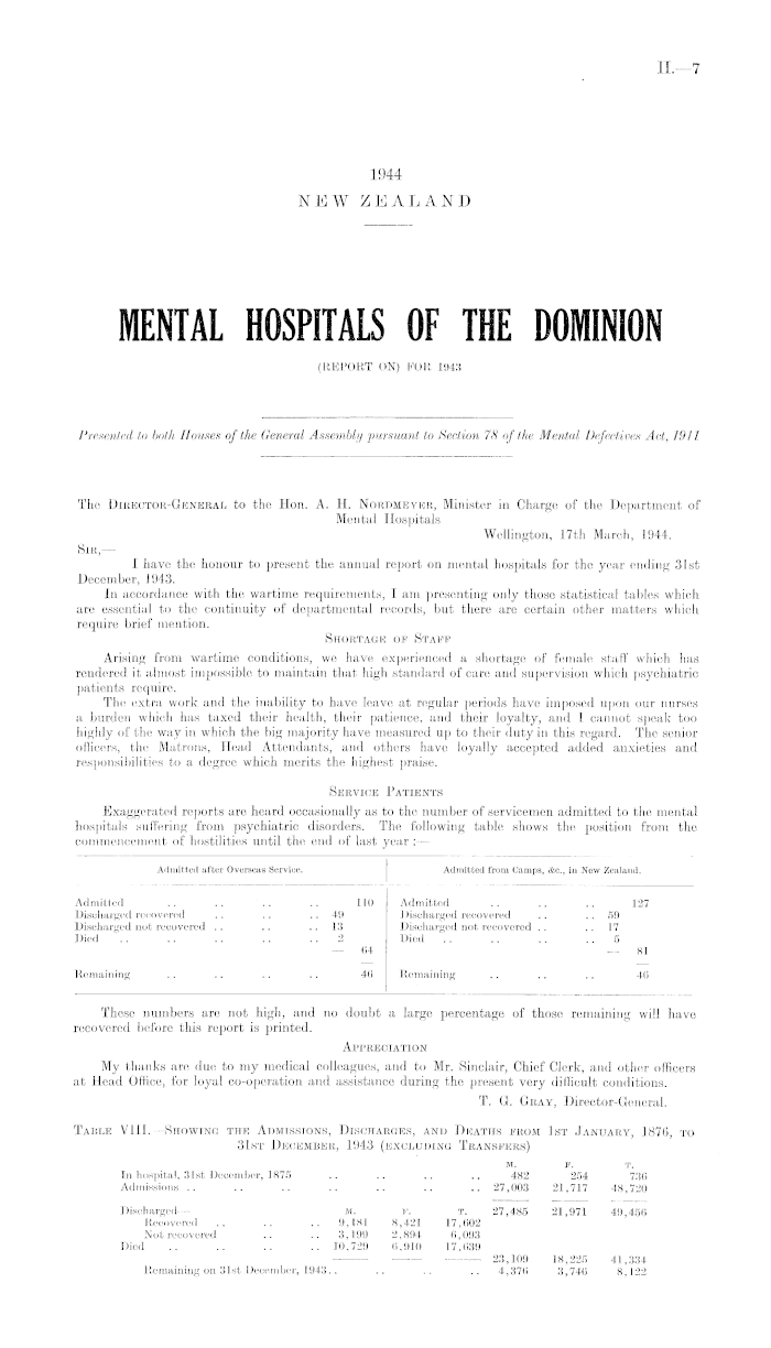 The Director-General to the Hon. A. H. Nordmeyer, Minister in Charge of the Department of Mental Hospitals Wellington, 17th March, 1944. Sir,— I have the honour to present the annual report on mental hospitals for the year ending 31st December, 1943. In accordance with the wartime requirements, I am presenting only those statistical tables which are essential to the continuity of departmental records, but there are certain other matters which require brief mention. Shortage of Staff Arising from wartime conditions, we have experienced a shortage of female staff which has rendered it almost impossible to maintain that high standard of care and supervision which psychiatric patients require. The extra work and the inability to have leave at regular periods have imposed upon our nurses a burden which has taxed their health, their patience, and their loyalty, and I cannot speak too highly of the way in which the big majority have measured up to their duty in this regard. The senior officers, the Matrons, Head Attendants, and others have loyally accepted added anxieties and responsibilities to a degree which merits the highest praise. Service Patients Exaggerated reports are heard occasionally as to the number of servicemen admitted to the mental hospitals suffering from psychiatric disorders. The following table shows the position from the commencement of hostilities until the end of last year : —