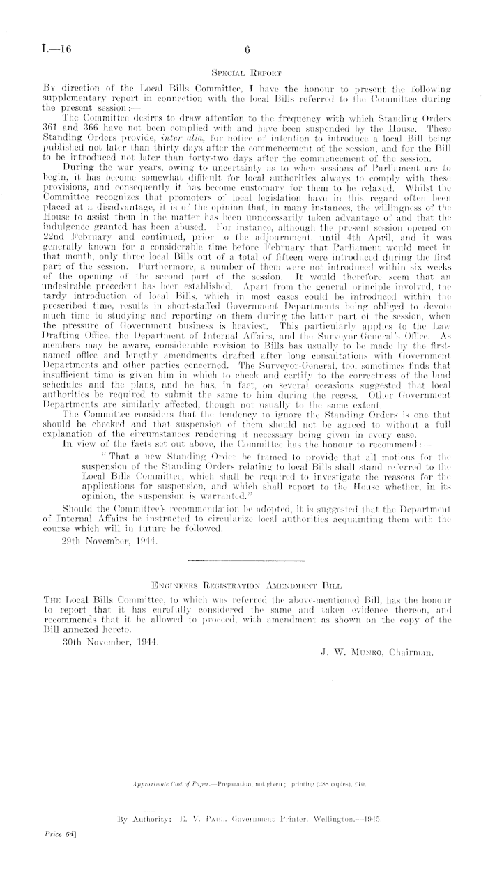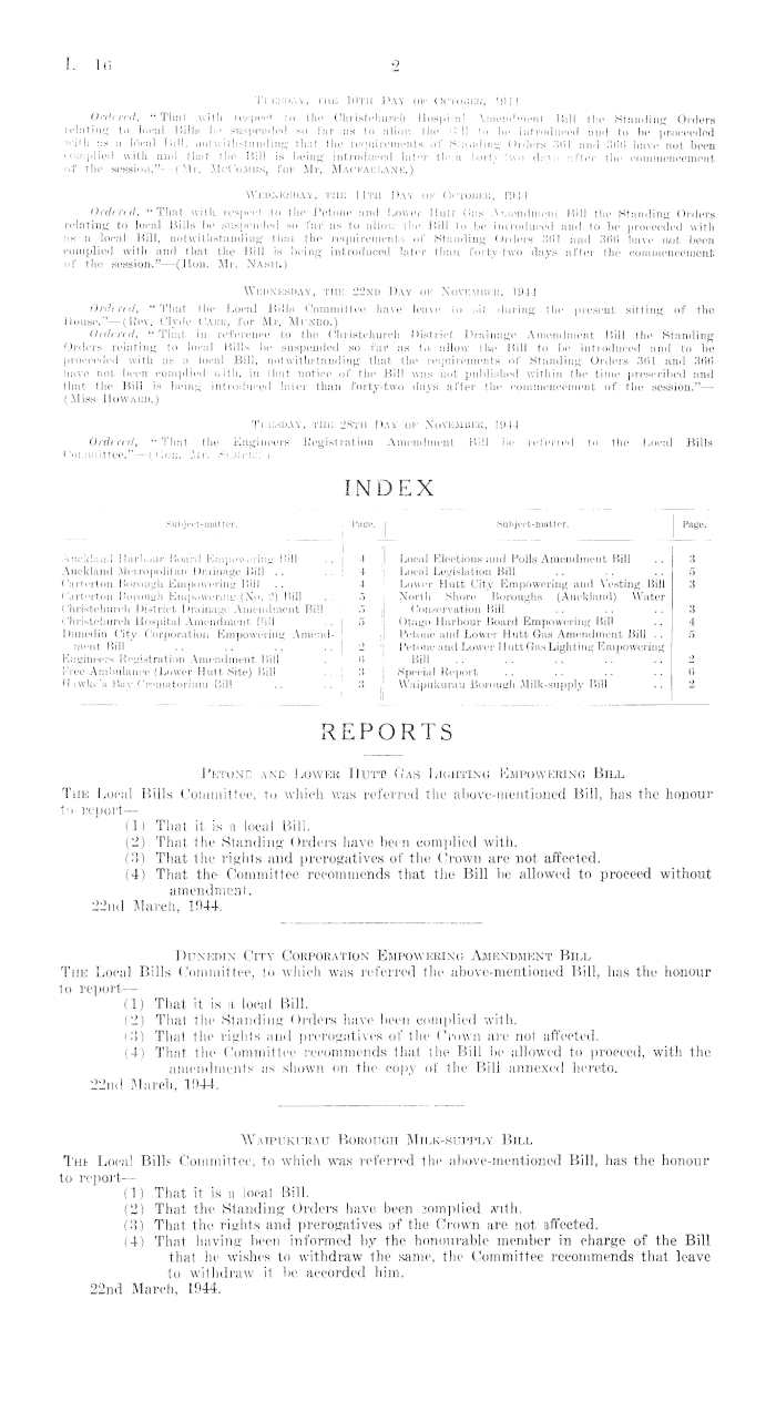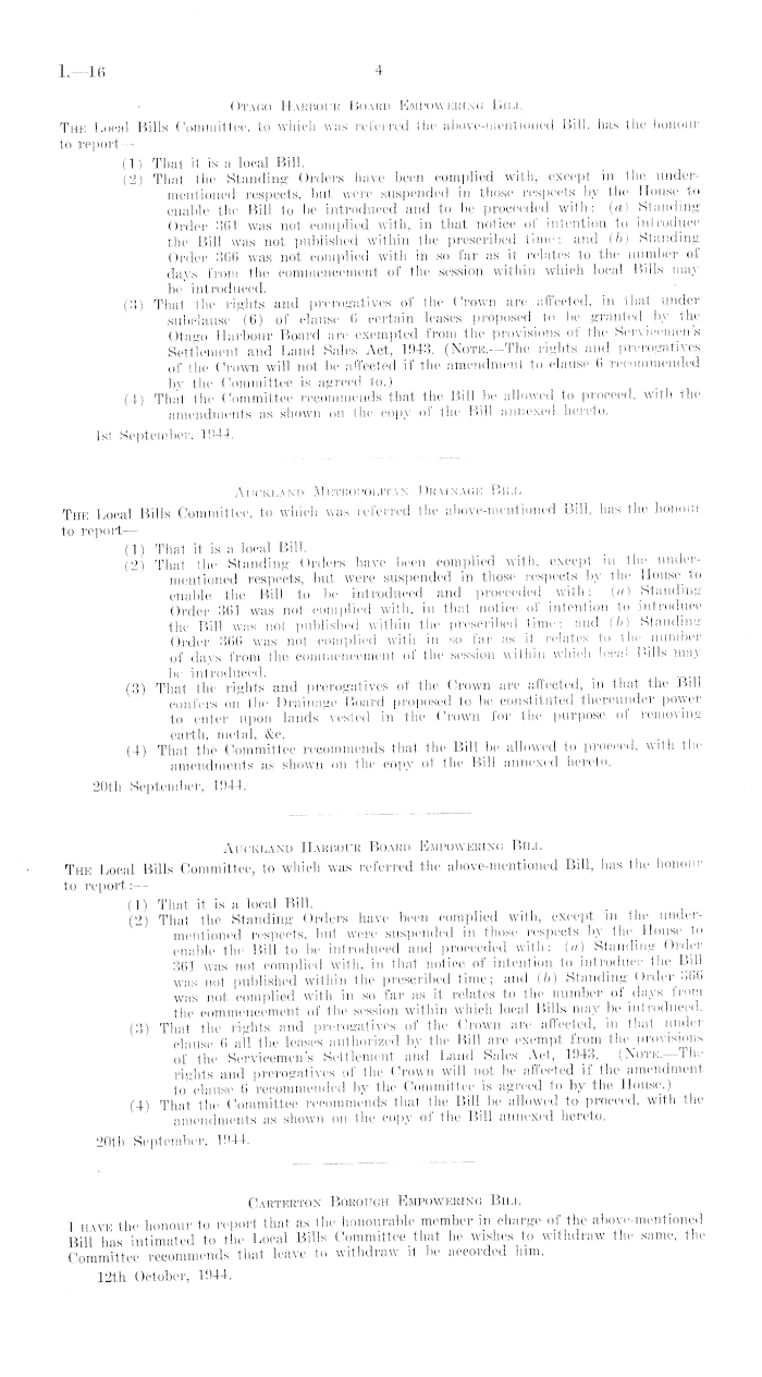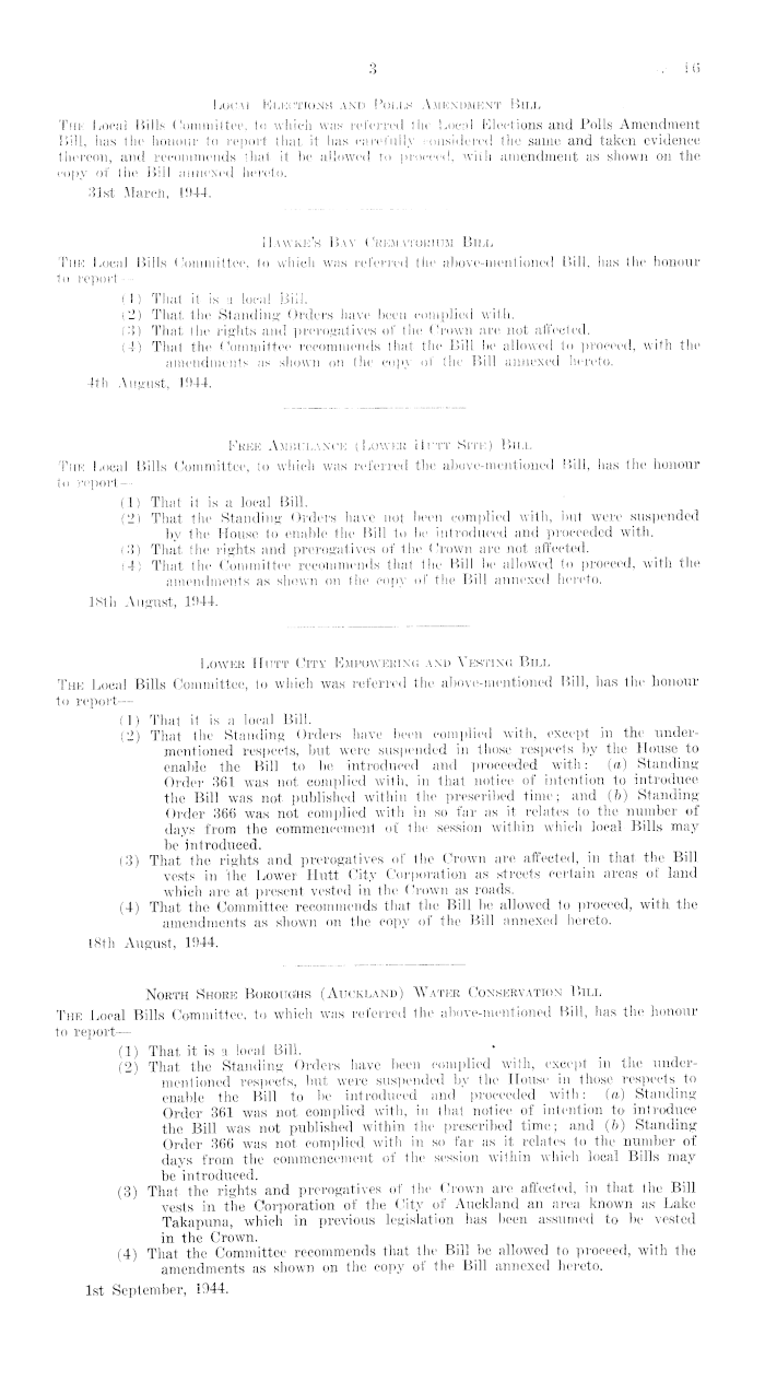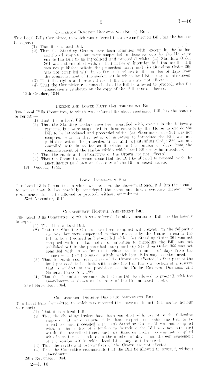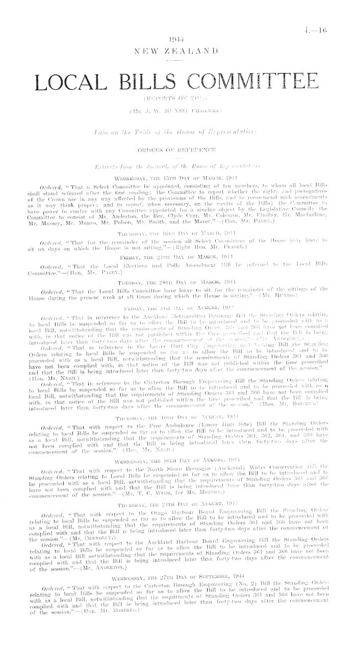 LOCAL BILLS COMMITTEE (REPORTS OF THE) (Mr. J. W. MUNRO, Chairman), Appendix to the Journals of the House of Representatives, 1944 Session I, I-16
