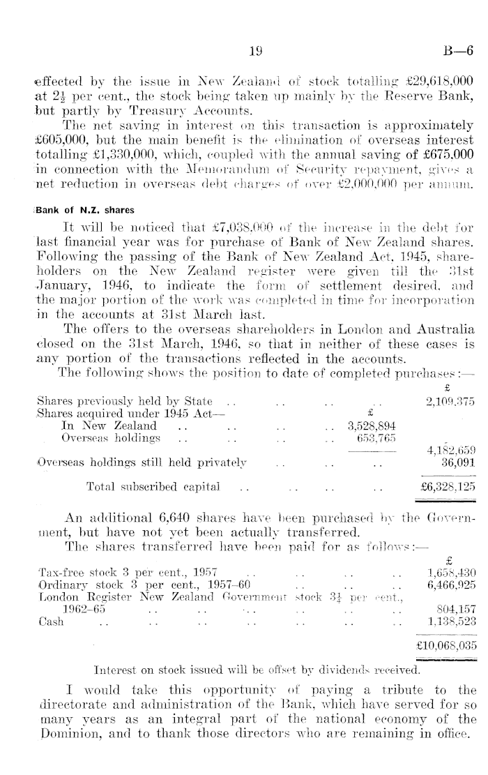 effected by the issue in New Zealand of stock totalling £29,618,000 at per cent., the stock being taken np mainly by the Reserve Bank, but partly by Treasury Accounts. The net saving in interest on this transaction is approximately £605,000, but the main benefit is the elimination of overseas interest totalling £1,330,000, which, coupled with the annual saving of £675,000 in connection with the Memorandum of Security repayment, gives a net reduction in overseas debt charges of over £2,000,000 per annum. ißank of N.Z. shares It will be noticed that £7,038,000 of the increase in the debt for last financial year was for purchase of Bank of New Zealand shares. Following the passing of the Bank of New Zealand Act, 1945, shareholders on the New Zealand register were given till the 31st January, 1946, to indicate the form of settlement desired, and ~fche major portion of the work was completed in time for incorporation in the accounts at 31st March last. The offers to the overseas shareholders in London and Australia closed on the 31st March, 1946, so that in neither of these cases is any portion of the transactions reflected in the accounts. The following shows the position to date of completed purchases:— £ Shares previously held by State .. .. .. .. 2,109,375 .Shares acquired under 1945 Act— £ In New Zealand .. .. .. .. 3,528,894 Overseas holdings .. .. .. .. 653,765 4,182,659 Overseas holdings still held privately .. .. .. 36,091 Total subscribed capital .. .. .. .. £6,328,125 An additional 6,640 shares have been purchased by the Government, but have not yet been actually transferred. The shares transferred have been paid for as follows: — £ Tax-free stock 3 per cent., 1957 .. .. .. .. 1,658,430 Ordinary stock 3 per cent., 1957-60 .. .. .. 6,466,925 London Register New Zealand Government stock 3£ per cent., 1962-65 .. .. .. .. .. .. 804,157 Cash .. .. .. .. .. .. .. 1,138,523 £10,068,035 Interest on stock issued will be offset by dividends received. I would take this opportunity of paying a tribute to the directorate and administration of the Bank, which have served for so many years as an integral part of the national economy of the Pominion, and to thank those directors who are remaining in office.