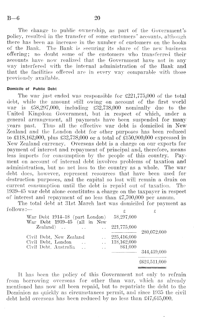 The change to public ownership, as part of the Government policy, resulted in the transfer of some customers' accounts, although there has been an increase in the number of customers on the books of the Bank. The Bank is securing its share of the new business offering; no doubt some of the customers who transferred their accounts have now realized that the Government have not in any way interfered with the internal administration of the Bank and that the facilities offered are in every way comparable with those previously available. Domicile of Public Debt The war just ended was responsible for £221,775,000 of the total debt, while the amount still owing on account of the first world war is £58,297,000, including £32,738,000 nominally due to the United Kingdom Government, but in respect of which, under a general arrangement, all payments have been suspended for many years past. Thus all the effective war debt is domiciled in New Zealand and the London debt for other purposes has been reduced to £118,162,000, plus £32,738,000 or a total of £150,900,000 expressed in New Zealand currency. Overseas debt is a charge on our exports for payment of interest and repayment of principal and, therefore, means less imports for consumption by the people of this country. Payment on account of internal debt involves problems of taxation and administration, but no net loss to the country as a whole. The war debt does, however, represent resources that have been used for destruction purposes, and the capital so lost will remain a drain on current consumption until the debt is repaid out of taxation. The 1939-45 war debt alone constitutes a charge on the taxpayer in respect of interest and repayment of no less than £7,700,000 per annum. The total debt at 31st March last was domiciled for payment as follows: — £ £ "War Debt 1914r-18 (part London) 58,297,000 "War Debt 1939-45 (all in New Zealand) .. .. .. 221,775,000 280,072,000 Civil Debt, New Zealand .. 225,416,000 Civil Debt, London .. .. 118,162,000 Civil Debt, Australia .. .. 861,000 344,439,000 £624,511,000 It has been the policy of this Government not only to refrain from borrowing overseas for other than war, which as already mentioned has now all been repaid, but to repatriate the debt to the Dominion as quickly as circumstances permit, and since 1935 the civil debt held overseas has been reduced by no less than £47,645,000.