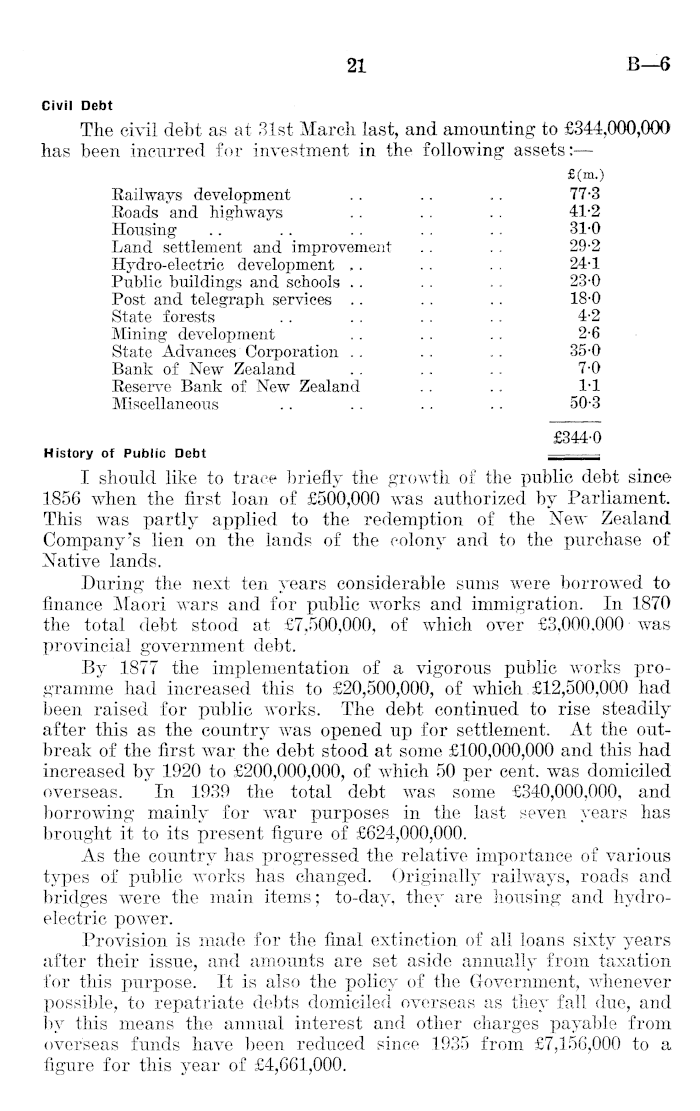 Civil Debt The civil debt as at 31st March last, and amounting to £344,000,000 has been incurred for investment in the following assets:— £(m.) Railways development .. .. .. 77-3 Roads and highways .. .. .. 41-2 Housing .. .. .. .. .. 31-0 Land settlement and improvement .. .. 29-2 Hydro-eleetrie development ». .. . . 24-1 Pnblic buildings and schools .. .. .. 23-0 Post and telegraph services .. .. .. 18-0 State forests .. .. .. .. 4-2 Mining development .. . . .. 2-6 State Advances 1 Corporation .. .. .. 35-0 Bank of New Zealand .. .. .. 7*o Reserve Bank of New Zealand .. .. I*l Miscellaneous .. .. .. .. 50-3 £344-0 History of Public Debt ■ I should like to trace briefly the growth of the public debt since 1856 when the first loan of £500,000 was authorized by Parliament. This was partly applied to the redemption of the New Zealand Company's lien on the lands of the colony and to the purchase of Native lands. During the next ten years considerable sums were borrowed to finance Maori wars and for public works and immigration. In 1870 the total debt stood at £7,500,000, of which over £3,000,000 was provincial government debt. By 1877 the implementation of a vigorous public works programme had increased this to £20,500,000, of which £12,500,000 had been raised for public works. The debt continued to rise steadily after this as the country was opened up for settlement. At the outbreak of the first war the debt stood at some £100,000,000 and this had increased by 1920 to £200,000,000, of which 50 per cent, was domiciled overseas. In 1939 the total debt was some £340,000,000, and borrowing mainly for war purposes in the last seven years has brought it to its present figure of £624,000,000. As the country has progressed the relative importance of various types of public works has changed. Originally railways, roads and bridges were the main items; to-day, they are housing and hydroelectric power. Provision is made for the final extinction of all loans sixty years after their issue, and amounts are set aside annually from taxation for this purpose. It is also the policy of the Government, whenever possible, to repatriate debts domiciled overseas as they fall due, and by this means the annual interest and other charges payable from overseas funds have been reduced since 1935 from £7,156,000 to a figure for this year of £4,661,000.