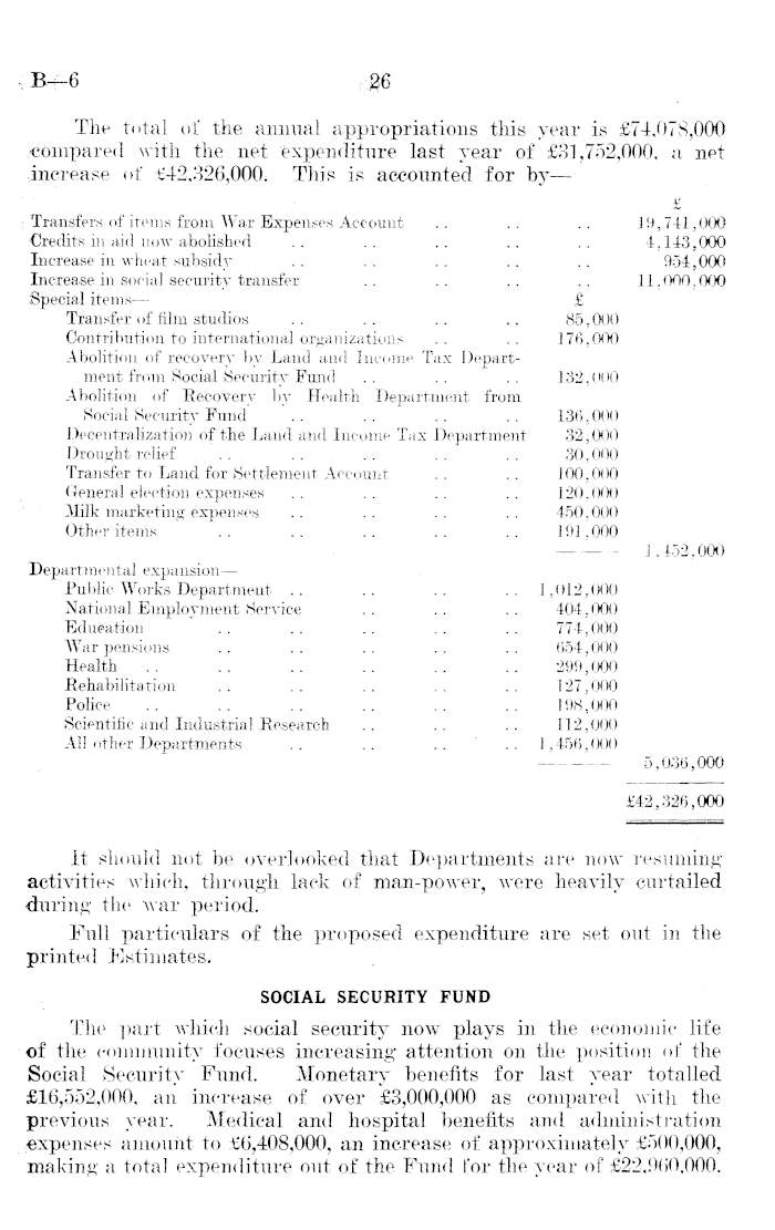 The total of the annual appropriations this year is £74,078,000 ■compared with the net expenditure last year of £31,752,000, a net increase of £42,326,000. This is accounted for by—- £ : Transfers of items from War Expenses Account .. .. .. 19,741,000 Credits in aid now abolished .. .. .. .. .. 4,143,000 Increase in wheat subsidy .. .. .. .. .. 954,000 Increase in social security transfer .. .. .. .. 11,000,000 Special items — £ Transfer of film studios .. .. .. .. 85,000 Contribution to international organizations .. .. 176,000 Abolition of recovery by Land and Income Tax Department from Social Security Fund .. .. .. 132,000 Abolition of Recovery by Health Department from Social Security Fund .. .. .. .. 136,000 Decentralization of the Land and Income Tax Department 32,000 Drought relief .. .. .. .. .. 30,000 Transfer to Land for Settlement Account .. .. 100,000 General election expenses .. .. .. . . 120,000 Milk marketing expenses .. .. .. .. 450,000 Other items .. .. .. .. .. 191,000 1,452,000 Departmental expansion— Public Works Department .. .. .. .. 1,012,000 National Employment Service .. .. .. 404,000 Education .. .. .. .. .. 774,000 War pensions " . .. ... .. .. 654,000 Health .. .. .. .. .. .. 299,000 Rehabilitation .. .. .. .. .. 127,000 Police .. .. .. .. .. .. 198,000 Scientific and Industrial Research .. .. .. 112,000 All other Departments .. .. .. 1,456,000 5,036,000 £42,326,000 It should not be overlooked that Departments are now resuming activities which, through lack of man-power, were heavily curtailed ■during the war period. Full particulars of the proposed expenditure are set out in the printed Estimates. SOCIAL SECURITY FUND The part which social security now plays in the economic life of the community focuses increasing attention on the position of the Social Security Fund. Monetary benefits for last year totalled £16,552,000, an increase of over £3,000,000 as compared with the previous year. Medical and hospital benefits and administration -expenses amount to £6,408,000, an increase of approximately £500,000, making a total expenditure out of the Fund for the year of £22,960,000.