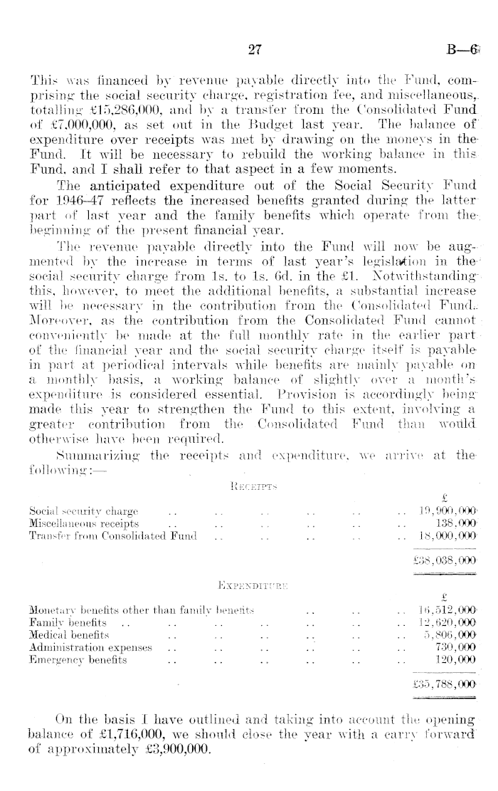 This was financed by revenue payable directly into the Fund, comprising the social security charge, registration fee, and totalling £15,286,000, and by a transfer from the Consolidated FuncL of £7,000,000, as set out in the Budget last year. The balance of expenditure over receipts was met by drawing on the moneys in theFund. It will be necessary to rebuild the working balance in this Fund, and I shall refer to that aspect in a few moments. The anticipated expenditure out of the Social Security Fund for 1946-47 reflects the increased benefits granted during the latter part of last year and the family benefits which operate from the-; beginning of the present financial year. The revenue payable directly into the Fund will now be augmented by the increase in terms of last year's legislation in thesocial security charge from Is. to Is. 6d. in the £l. Notwithstandingthis, however, to meet the additional benefits, a substantial increase will be necessary in the contribution from the Consolidated Fund:. Moreover, as the contribution from the Consolidated Fund cannot conveniently be made at the full monthly rate in the earlier part of the financial year and the social security charge itself is payable in part at periodical intervals while benefits are mainly payable on a monthly basis, a working balance of slightly over a month's expenditure is considered essential. Provision is accordingly beingmade this year to strengthen the Fund to this extent, involving a greater contribution from the Consolidated Fund than would otherwise have been required. Summarizing the receipts and expenditure, we arrive at thefollowing:— Receipts £ Social security charge .. .. .. .. .. .. 19,900,000 Miscellaneous receipts .. .. .. .. .. .. 138,000' Transfer from Consolidated Fund .. .. .. .. .. 18,000,000 £38,038,000' Expenditure £ . Monetary benefits other than family benefits .. .. .. 16,512,000 Family benefits .. .. .. .. .. .. .. 12,620,000 Medical benefits .. .. .. .. .. 5,806,000 Administration expenses .. .. .. .. .. .. 730,000 Emergency benefits .. .. .. .. .. .. 120,000 £35,788,000 On the basis I have outlined and taking into account the opening balance of £1,716,000, we should close the year with a carry forward of approximately £3,900,000.