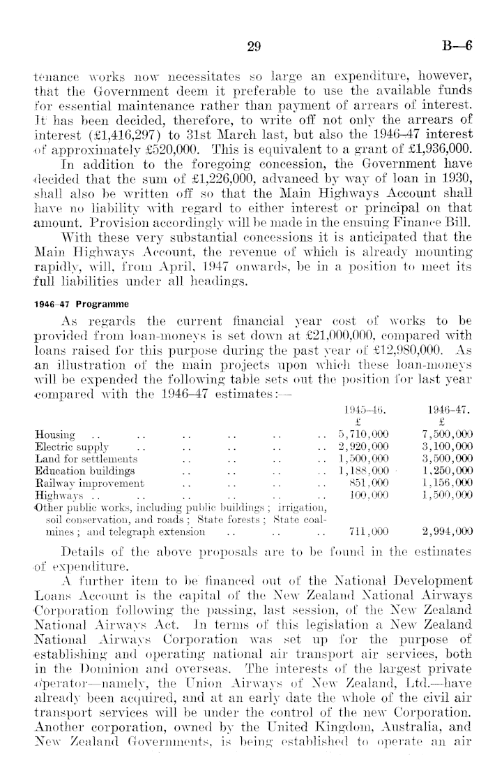 tenance works now necessitates so large an expenditure, however, that the Government deem it preferable to use the available funds for essential maintenance rather than payment of arrears of interest. It ! has been decided, therefore, to write off not only the arrears of interest (£1,416,297) to 31st March last, but also the interest •of approximately £520,000. This is equivalent to a grant of £1,936,000. In addition to the foregoing concession, the Government have decided that the sum of £1,226,000, advanced by way of loan in 1930, shall also be written off so that the Main Highways Account shall have no liability with regard to either interest or principal on that amount. Provision accordingly will be made in the ensuing Finance Bill. With these very substantial concessions it is anticipated that the Main Highways Account, the revenue of which is already mounting rapidly, will, from April, 1947 onwards, be in a position to meet its full liabilities under all headings. 1946-47 Programme As regards the current financial year cost of works to be provided from loan-moneys is set down at £21,000,000, compared with loans raised for this purpose during the past year of £12,980,000. As an illustration of the main projects upon which these loan-moneys will be expended the following table sets out the position for last year •compared with the 1946-47 estimates: — 1945-46. 1946-47. £ £ Housing .. .. .. .. .. .. 5,710,000 7,500,000 Electric supply .. .. .. .. .. 2,920,000 3,100,000 Land for settlements .. .. .. .. 1,500,000 3,500,000 Education buildings .. .. .. .. 1,188,000 1,250,000 Railway improvement .. .. .. .. 851,000 1,156,000 Highways .. .. .. .. .. .. 100,000 1,500,000 Other public works, including public buildings ; irrigation, soil conservation, and roads ; State forests ; State coalmines ; and telegraph extension .. .. .. 711,000 2,994,000 Details of the above proposals are to be found in the estimates of expenditure. A further item to be financed out of the National Development Loans Account is the capital of the New Zealand National Airways •Corporation following the passing, last session, of the New Zealand National Airways Act. In terms of this legislation a New Zealand National Airways Corporation was set up for the purpose of ■establishing and operating national air transport air services, both in the Dominion and overseas. The interests of the largest private ■Operator—namely, the Union Airways of New Zealand, Ltd.—have already been acquired, and at an early date the whole of the civil air transport services will be under the control of the new Corporation. Another corporation, owned by the United Kingdom, Australia, and New Zealand Governments, is being established to operate an air