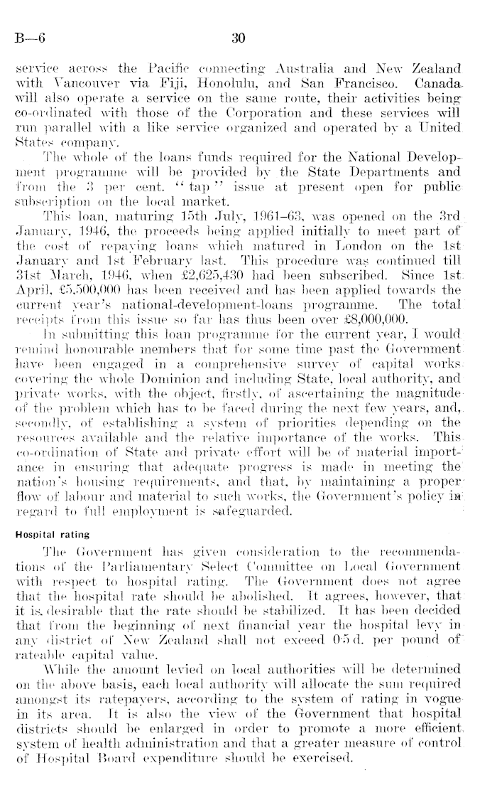 service across the Pacific connecting Australia and New Zealand with Vancouver via Fiji, Honolulu, and San Francisco. Canada will also operate a service on the same route, their activities being-co-ordinated with those of the Corporation and these services will run parallel with a like service organized and operated by a UnitedStates company. The whole of the loans funds required for the National Development programme will be provided by the State Departments and from the 3 per cent. " tap " issue at present open for publicsubscription on the local market. This loan, maturing 15th July, 1961-63, was opened on the 3rd January, 1946, the proceeds being applied initially to meet part of the cost of repaying loans which matured in London on the Ist; January and Ist February last. This procedure was continued till 31st March, 1946, when £2,625,430 had been subscribed. Since Ist: April, £5,500,000 has been received and has been applied towards the current year's national-development-loans programme. The total receipts from this issue so far has thus been over £8,000,000. In submitting this loan programme for the current year, I would remind honourable members that for some time past the Government: have been engaged in a comprehensive survey of capital works, covering the whole Dominion and including State, local authority, and private works, with the object, firstly, of ascertaining the magnitude of the problem which has to be faced during the next few years, and,,, secondly, of establishing a system of priorities depending on the resources available and the relative importance of the works. This; co-ordination of State and private effort will be of material import- : ance in ensuring that adequate progress is made in meeting the nation's housing requirements, and that, by maintaining a properflow of labour and material to such works, the Government's policy in regard to full employment is safeguarded. Hospital rating The Government has given consideration to the recommendations of the Parliamentary Select Committee on Local Government with respect to hospital rating. The Government does not agree that the hospital rate should be abolished. It agrees, however, that; it is. desirable that the rate should be stabilized. It has been decided that from the beginning of next financial year the hospital levy in any district of New Zealand shall not exceed 05 d. per pound of" rateable capital value. While the amount levied on local authorities will be determined on the above basis, each local authority will allocate the sum required amongst its ratepayers, according to the system of rating in voguein its area, It is also the view of the Government that hospital districts should be enlarged in order to promote a more efficient system of health administration and that a greater measure of control of Hospital Board expenditure should be exercised.