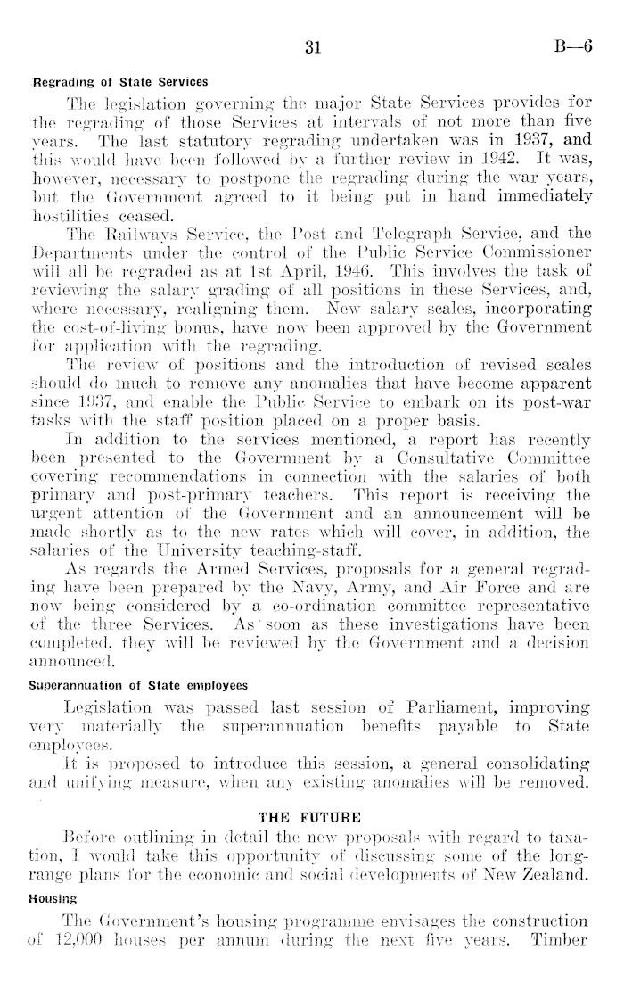 'Regrading of State Services The legislation governing the major State Services provides for the regrading of those Services at intervals of not more than five years. The last statutory regrading undertaken was in 1937, and this would have been followed by a further review in 1942. It was, however, necessary to postpone the regrading during the war years, but the Government agreed to it being put in hand immediately hostilities ceased. The Railways Service, the Post and Telegraph Service, and the Departments under the control of the Public Service Commissioner will all be regraded as at Ist April, 1946. This involves the task of reviewing the salary grading of all positions in these Services, and, where necessary, realigning them. New salary scales, incorporating the cost-of-living bonus, have now been approved by the Government for application with the regrading. The review of positions and the introduction of revised scales should do much to remove any anomalies that have become apparent since 1937, and enable the Public Service to embark on its post-war tasks with the staff position placed on a proper basis. In addition to the services mentioned, a report has recently been presented to the Government by a Consultative Committee •covering recommendations in connection with the salaries of both primary and post-primary teachers. This report is receiving the urgent attention of the Government and an announcement will be made shortly as to the new rates which will cover, in addition, the salaries of the University teaching-staff. As regards the Armed Services, proposals for a general regrading have been prepared by the Navy, Army, and Air Force and are now being considered by a co-ordination committee representative of the three Services. As' soon as these investigations have been completed, they will be reviewed by the Government and a decision announced. Superannuation of State employees Legislation was passed last session of Parliament, improving very materially the superannuation benefits payable to State employees. It is proposed to introduce this session, a general consolidating and unifying, measure, when any existing anomalies will be removed. THE FUTURE Before outlining in detail the new proposals with regard to taxation, I would take this opportunity of discussing some of the longrange plans for the economic and social developments of New Zealand. Housing The Government's housing programme envisages the construction of 12,000 houses per annum during the next five years. Timber
