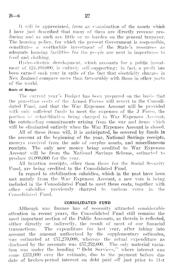 It will be appreciated, from an examination of the assets which I have just, described-that many of them are directly revenue producing and as such are little or no burden on the general taxpayer. The housing' policy, for which the present Government is responsible, •constitutes a worthwhile investment of the State's resources as -adequate housing facilities for the people are next, in importance to food and clothing. Hydro-electric development, which accounts for a public investment of £24,100,000, is entirely self-supporting; in fact, a profit has been earned each year in spite of the fact that electricity charges in New Zealand compare more than favourably with those in other parts of the world. EBasis of Budget The current year's Budget has been prepared on the basis that the peacetime costs of the Armed Forces will revert to the Consolidated Fund, and that the War Expenses Account will be provided with only sufficient funds to meet the expenses of the J Force, the portion of rehabilitation being charged to War Expenses Account, the outstanding commitments arising from the war and items which "will be eliminated entirely when the War Expenses Account is closed. All of these items will, it is anticipated, be covered by funds in "the account at the beginning of the year, National Savings receipts, moneys received from the sale of surplus assets, and miscellaneous receipts. The only new money being credited to War Expenses Account will be from the National Savings Scheme, estimated to produce £6,000,000 for the year. All taxation receipts, other than those for the Social Security Fund, are being credited to the Consolidated Fund. In regard to stabilization subsidies, which in the past have been met mainly from the War Expenses Account, a new vote is being included in the Consolidated Fund to meet these costs, together with other subsidies previously charged to various votes in the Oonsolidated Fund. CONSOLIDATED FUND Although war finance has of necessity attracted considerable in recent years, the Consolidated Fund still remains the most important section of the Public Accounts, as therein is reflected, oither directly or indirectly, the result of most of our financial transactions. The expenditure for last year, after taking into -account the amount authorized by the supplementary estimates, was estimated at £57,270,000, whereas the actual expenditure as •disclosed by the accounts was £57,252,000. The only material variation was under the heading " Debt Services," where interest was some £331,000 over the estimate, due to the payment before due -date of broken-period interest on debt paid off just prior to 31st
