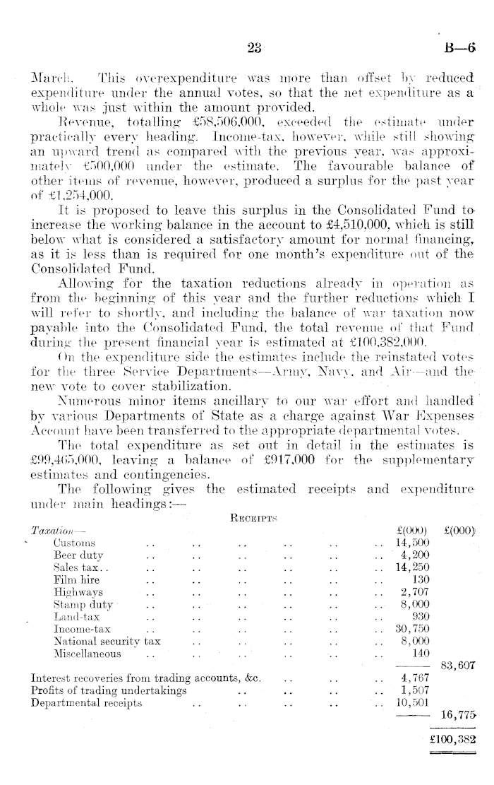 March. This overexpenditure Was more than offset by reduced expenditure under the annual votes, so that the net expenditure as a whole was just within the amount provided. Revenue, totalling £58,506,000, exceeded the estimate under practically every heading. Income-tax, however, while still showing an upward trend as compared with the previous year, was approximately £500,000 under the estimate. The favourable balance of other items of revenue, however, produced a surplus for the past year of £1,254,000. It is proposed to leave this surplus in the Consolidated Fund to increase the working balance in the account to £4,510,000, which is still below what is considered a satisfactory amount for normal financing, as it is less than is required for one month's expenditure out of the Consolidated Fund. Allowing for the taxation reductions already in operation as from the beginning of this year and the further reductions which I will refer to shortly, and including the balance of war taxation now payable into the Consolidated Fund, the total revenue of that Fund during the present financial year is estimated at £100,382,000. On the expenditure side the estimates include the reinstated votes for the three Service Departments—Army, Navy, and Air —and the new vote to cover stabilization. Numerous minor items ancillary to our war effort and handled by various Departments of State as a charge against War Expenses Account have been transferred to the appropriate departmental votes. The total expenditure as set out in detail in the estimates is £99,465,000, leaving a balance of £917,000 for the supplementary estimates and contingencies. The following gives the estimated receipts and expenditure under main headings:— Receipts Taxation — £(000) £(000) Customs .. .. :■. „ . .. .. .. 14,500 Beer duty .. .. .. .. .. .. 4,200 Sales tax.. .. .. .. .. .. .. 14,250 Film hire .. .. .. .. .. .. 130 Highways .. .. .. .. .. .. 2,707 Stamp duty .. .. .. ... ... .. 8,000 Land-tax .. .. .. .. .. .. 930 Income-tax .. .. .. .. .. .. 30,750 National security tax .. .. .. .. .. 8,000 Miscellaneous .. .. .. .. .. .. 140 83.60T Interest recoveries from trading accounts, &c. .. .. .. 4,767 Profits of trading undertakings .. .. .. .. 1,507 Departmental receipts .. .. .. .. ~. 10,501 16,775 £100,382