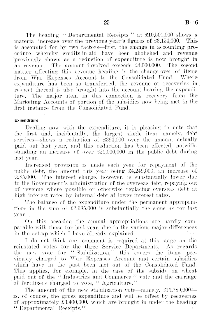 The heading " Departmental Receipts " at £10,501,000 shows a material increase over the previous year's figures of £3,154,000. This is accounted for by two factors—first, the change in accounting procedure whereby credits-in-aid have been abolished and revenue previously shown as a reduction of expenditure is now brought in as revenue. The amount involved exceeds £4,000,000. The second matter affecting this revenue heading is the change-over of items from War Expenses Account to the Consolidated Fund. Where expenditure has been so transferred, the revenue or recoveries in respect thereof is also brought into the account bearing the expenditure. The major item in this connection is recovery from the Marketing Accounts of portion of the subsidies now being met in the first instance from the Consolidated Fund. Expenditure Dealing now with the expenditure, it is pleasing to note that the first and, incidentally, the largest single item —namely, debt services—shows a reduction of £394,000 over the amount actually paid out last year, and this reduction has been effected, notwithstanding an increase of over £21,000,000 in the public debt during last year. Increased provision is made each year for repayment of the public debt, the amount this year being £4,249,000, an increase of £285,000. The interest charge, however, is substantially lower due to the Government's administration of the overseas debt, repaying out of revenue where possible or otherwise replacing overseas debt at high interest rates by internal debt at lower interest rates. The balance of the expenditure under the permanent appropriations in the sum of £2,985,000 is substantially the same as for last year. On this occasion the annual appropriations are hardly comparable with those for last year, due to the various major differences in the set-up which I have already explained. I do not think any comment is required at this stage on the reinstated votes for the three Service Departments. As regards the new vote for " Stabilization," this covers the items previously charged to War Expenses Account and certain subsidies which have in the past been met out of the Consolidated Fund. This applies, for example, in the case of the subsidy on wheat paid out of the " Industries and Commerce " vote and the carriage of fertilizers charged to vote, " Agriculture." The amount of the new stabilization vote —namely, £13,789,000 is, of course, the gross expenditure and will be offset by recoveries of approximately £3,400,000, which are brought in under the heading " Departmental Receipts." •