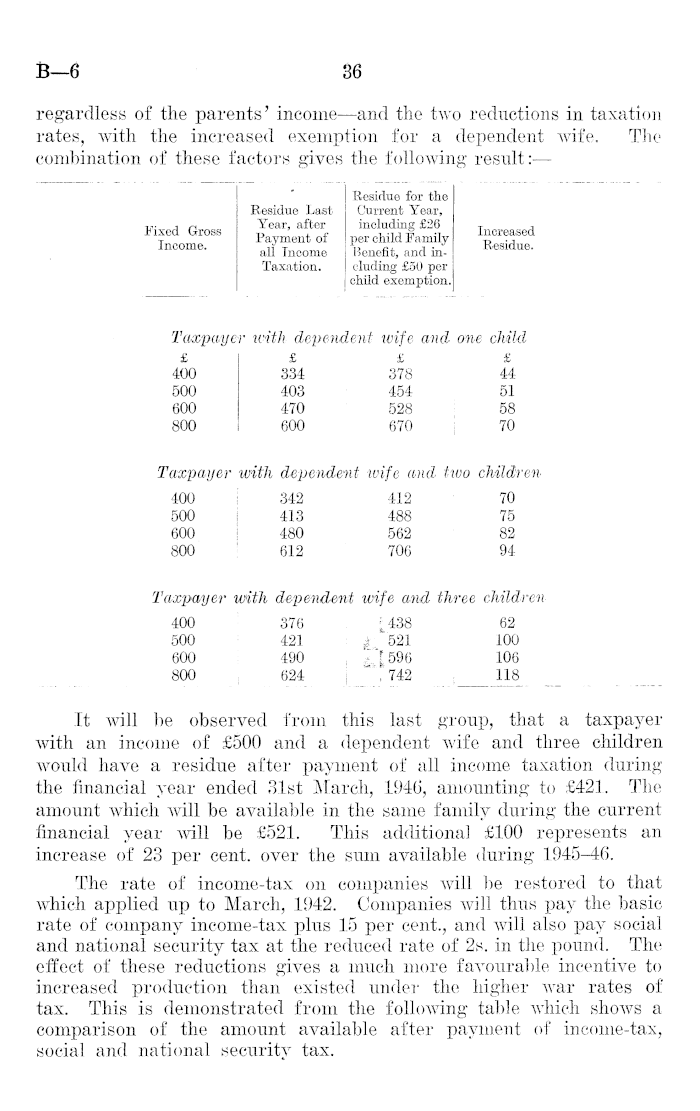 Fixed Gross Income. Residue Last Year, after Payment of all Income Taxation. Residue for the Current Year, including £26 per child Family Benefit, and including £50 per child exemption. Increased Residue. Taxpayer with dependent wife and one cMld £ £ £ £ 400 334 378 44 500 403 454 51 600 470 528 58 800 600 670 70 Taxpayer with dependent wife and two children 400 342 412 70 500 413 488 75 600 480 562 82 800 612 706 94Taxpayer with dependent wife and three children 400 376 J, 438 62 500 421 & 521 100 600 490 ill 596 106 800 624 , 742 118