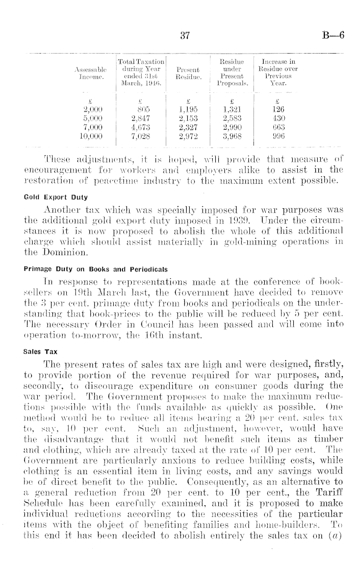 These adjustments, it is hoped, will provide that measure of encouragement for workers and employers alike to assist in the restoration of peacetime industry to the maximum extent possible. Gold Export Duty Another tax which was specially imposed for war purposes was the additional gold export duty imposed in 1939. Under the circumstances it is now proposed to abolish the whole of this additional charge which should assist materially in gold-mining operations in the Dominion. Primage Duty on Books and Periodicals In response to representations made at the conference of booksellers on 19th March last, the Government have decided to remove the 3 per cent, primage duty from books and periodicals on the understanding that book-prices to the public will be reduced by 5 per cent. The necessary Order in Council has been passed and will come into operation to-morrow, the 16th instant. Sales Tax The present rates of sales tax are high and were designed, firstly, to provide portion of the revenue required for war purposes, and, secondly, tb discourage expenditure on consumer goods during the war period. The Government proposes to make the maximum reductions possible with the funds available as quickly as possible. One method would be to reduce all items bearing a 20 per cent, sales tax to, say, 10 per cent. Such an adjustment, however, would have tlje disadvantage that it would not benefit such < items as timber and clothing, which are already taxed at the rate of 10 per cent. The Government are particularly anxious to reduce building costs, while clothing is an essential item in living costs, and any savings would be of direct benefit to the public. Consequently, as an alternative to a general reduction from 20 per cent, to 10 per cent., the Tariff Schedule has been carefully examined, and it is proposed to make individual reductions according to the necessities of the particular items with the object of benefiting families and home-builders. To this end it has been decided to abolish entirely the sales tax on (a)