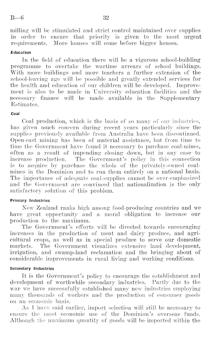 milling will be stimulated and strict control maintained over supplies in order to ensure that priority is given to the most urgent requirements. More houses will come before bigger houses. Education In the field of education there will be a vigorous school-building programme to overtake the wartime arrears of school buildings. With more buildings and more teachers a further extension of the school-leaving age will be possible and greatly extended services for the health and education of our children will be developed. Improvement is also to be made in University education facilities and the necessary finance will be made available in the Supplementary Estimates. Coal Coal production, which is the basis of so many of our industries, has given much concern during recent years particularly since the supplies previously available from Australia have been discontinued. Open-cast mining has been of material assistance, but from time to time the Government have found it necessary to purchase coal-mines,, often as a result of impending closing down, but in any case to increase production. The Government's policy in this connection is to acquire by purchase the whole of the privately-owned coalmines in the Dominion and to run them entirely on a national basis. The importance of adequate coal-supplies cannot be over-emphasized and the Government are convinced that nationalization is the only satisfactory solution of this problem. Primary Industries New Zealand ranks high among food-producing countries and we have great opportunity and a moral obligation to increase our production to the maximum. The Government's efforts will be directed towards encouraging increases in the production of meat and dairy produce, and agricultural crops, as well as in special produce to serve our domestic markets. The Government visualizes extensive land development, irrigation, and swamp-land reclamation and the bringing about of considerable improvements in rural living and working conditions. Secondary Industries It is the Government's policy to encourage the establishment and development of worthwhile secondary industries. Partly due to the war we have successfully established many new industries employing many thousands of workers and the production of consumer goods on an economic basis. As I have said earlier, import selection will still be necessary to ensure the most economic use of the Dominion's overseas funds. Although the maximum quantity of goods will be imported within the