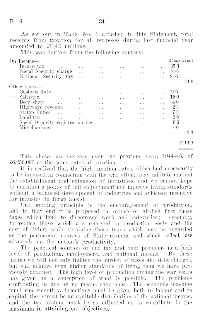 As set put in Table No. 1 attached to this Statement, total receipts from taxation for all purposes during last financial year amounted to £ll4 9 millions. This was derived from the following sources:— On income— £(m.) £(m.) Income-tax .. .. .. .. .. .. 35-3 Social Security charge . . .. .. .. . . 14-6 National Security tax .. .. .. .. .. 21*7 7l-6 Other taxes— Customs duty .. .. .. .. .. .. 11-7 - Sales-tax .. .. .. .. .. .. 15-0 Beer duty . . .. .. .. .. 4-0 Highways revenue .. .. .. .. .. 2-3 Stamp duties . . .. .. .. .. 7-8 Land-tax . . . . .. .. .. .. 0 9 Social Security registration fee . . . . .. .. 0-6 Miscellaneous . . .. .. .. \ . .. 10 43-3 £ll4-9 This shows an increase over the previous year, 1944-45, of £6,250,000 at the same rates of taxation. It is realized that the high taxation rates, which had necessarily to be imposed in connection with the war effort, may militate against the establishment and extension of industries, and we cannot hope to maintain a policy of full employment nor improve living standards without a balanced development of industries and sufficient incentive for industry to forge ahead. Our guiding principle is the encouragement of production, and to that end it is proposed to reduce or abolish first those taxes which tend to discourage work and enterprise; secondly, to reduce those which are reflected in production costs and the cost of living, while retaining those taxes which may be regarded as the. permanent sources of State revenue and which reflect less adversely on the nation's productivity. The practical solution of our tax and debt problems is a high level of production, employment, and national income. By these means we will not only lighten the burden of taxes and debt charges, but will achieve even higher standards of living than we have previously attained. The high level of production during the war years has given us a conception of what is possible. The problems confronting us are by no means easy ones. The economic machine must run smoothly, incentives must be given both to labour and to capital, there must be an equitable distribution of the national income, and the tax system must be so adjusted as to contribute to the maximum in attaining our objectives.