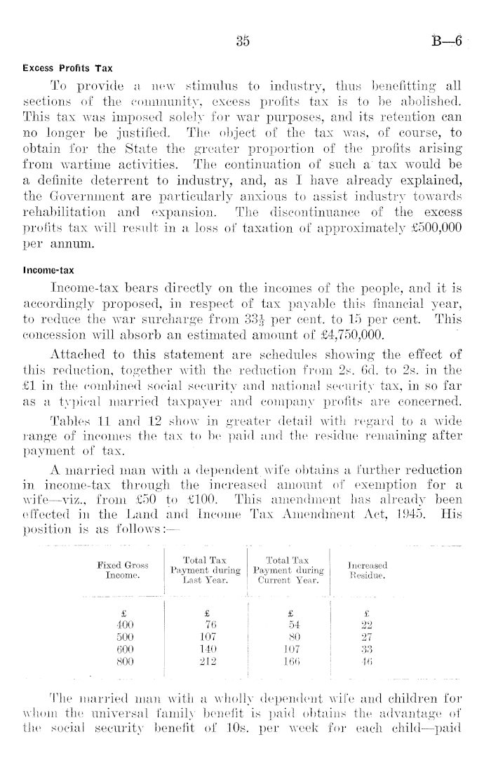 Excess Profits Tax To provide a new stimulus to industry, thus benefitting all sections of the community, excess profits tax is to be abolished. This tax was imposed solely for war purposes, and its retention can no longer be justified. The object of the tax was, of course, to obtain for the State the greater proportion of the profits arising from wartime activities. The continuation of such a' tax would be a definite deterrent to industry, and, as I have already explained, the Government are particularly anxious to assist industry towards rehabilitation and expansion. The discontinuance of the excess profits tax will result in a loss of taxation of approximately £500,000 per annum. Income-tax Income-tax bears directly on the incomes of the people, and it is accordingly proposed, in respect of tax payable this financial year, to reduce the war surcharge from 33£ per cent, to 15 per cent. This concession will absorb an estimated amount of £4,750,000. Attached to this statement are schedules showing the effect of this reduction, together with the reduction from 2s. 6d. to 2s. in the £1 in the combined social security and national security tax, in so far as a typical married taxpayer and company profits are concerned. Tables 11 and 12 show in greater detail with regard to a wide range of incomes the tax to be paid and the residue remaining after payment of tax.