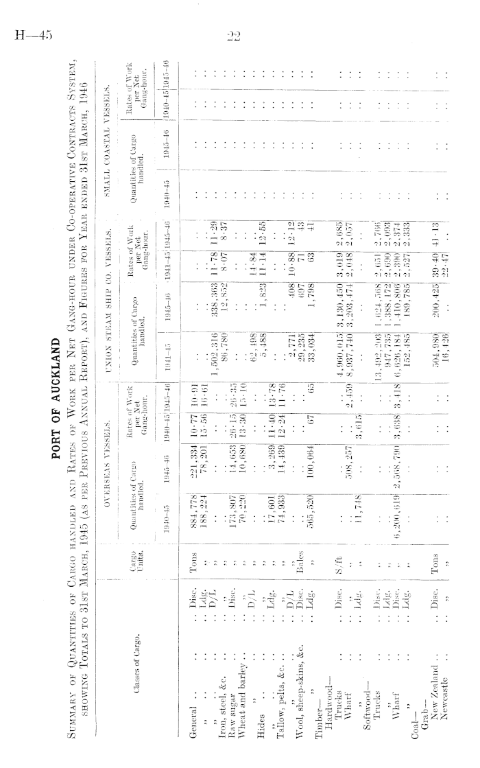PORT OF AUCKLAND Summary of Quantities of Cargo handled and Rates of Work per Net Gang-hour under Co-operative Contracts System, showing Totals to 31st March, 1945 (as per Previous Annual Report), and Figures for Year ended 31st March, 1946