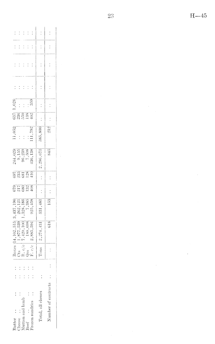 Butter .. .. .... Boxes 14,102,515 3,437,196 679 697 244,029 11,052 637 1,028 Cheese .. .. . . . Cts 1,877,539 262,125 217 235 9,155 .. 236 . . Mutton and lamb .. -. R. c/c 7,420,100 1,328.186 680 681 96,239 .. 550 .. Beef .. .. .... Qrs 180,698 7,385 132 128 7,508 .. 138 . . Frozen sundries .. .... F. c/c 2,885,594 925,458 408 410 436,138 111,792 402 359 Total, all classes .. Tons 2,274,431 531,481 .. .. 2,296,675 585,800 .. Number of contracts .. .. .. 618 153 .. .. 845 212