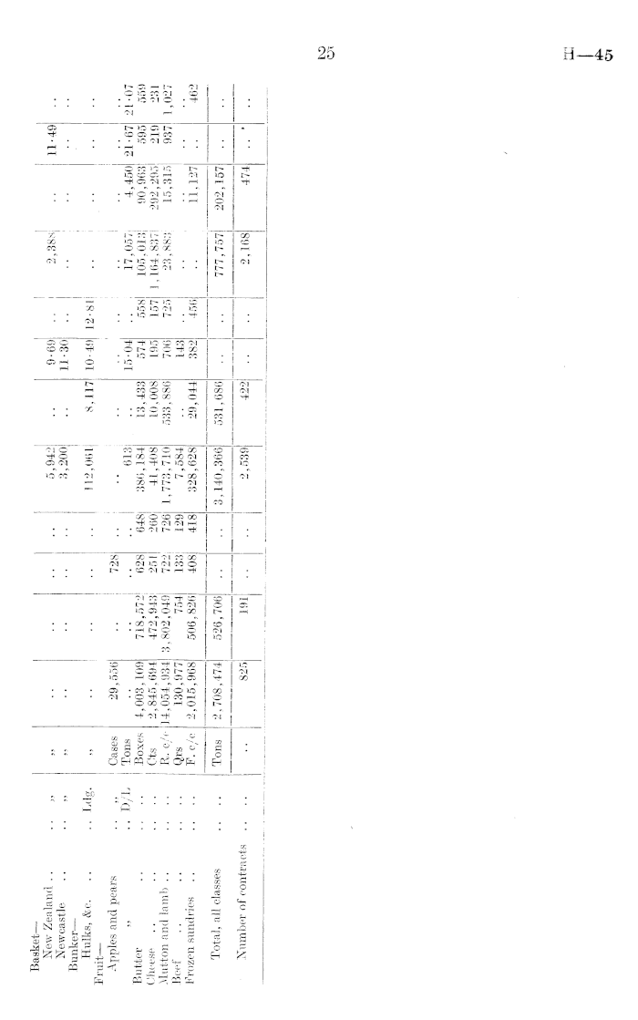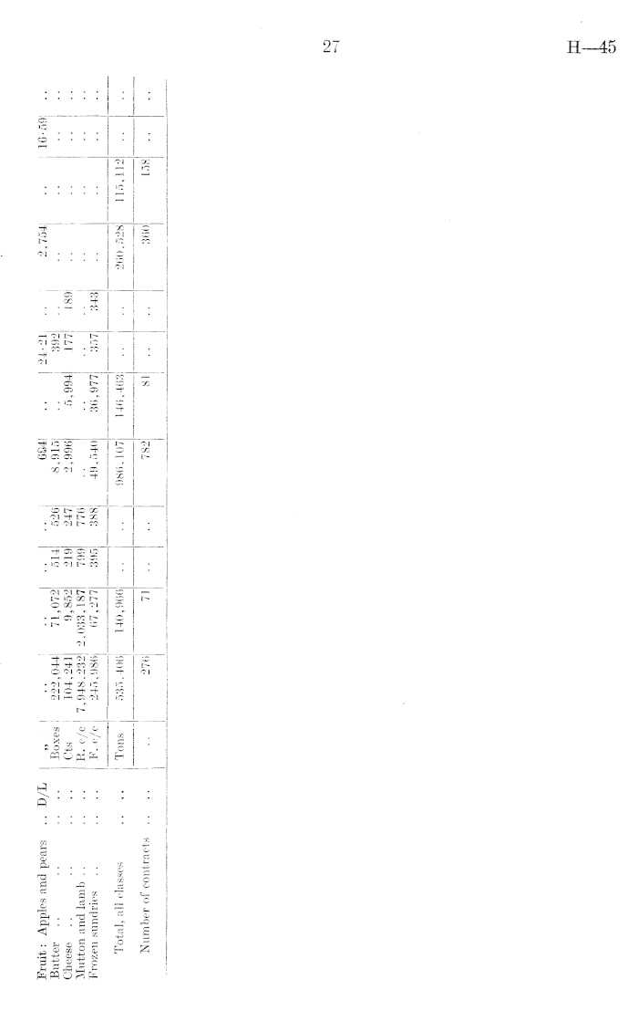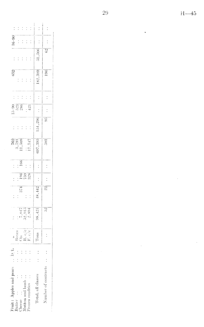 FruitApples and pears . Ldg. Cases 134,479 62,582 471 464 . D/L Tons "• 870 300 16-68 13-79 Butter Boxes 226,068 100,634 524 438 7,003 475 Cheese Cts 10,027 1,455 174 176 127 190 Mutton and lamb R. c/c Qrs 5,871,503 2,052,875 786 713 50,989 690 Beef 67,402 1,151 140 132 , , Frozen sundries F. c/c 1,243,274 642,719 453 388 15,528 302 7,627 •• 436 Total, all classes Number of contracts , Tons 278,223 96,210 200,363 51,849 68,989 36,118 110 39 154 35 200 77