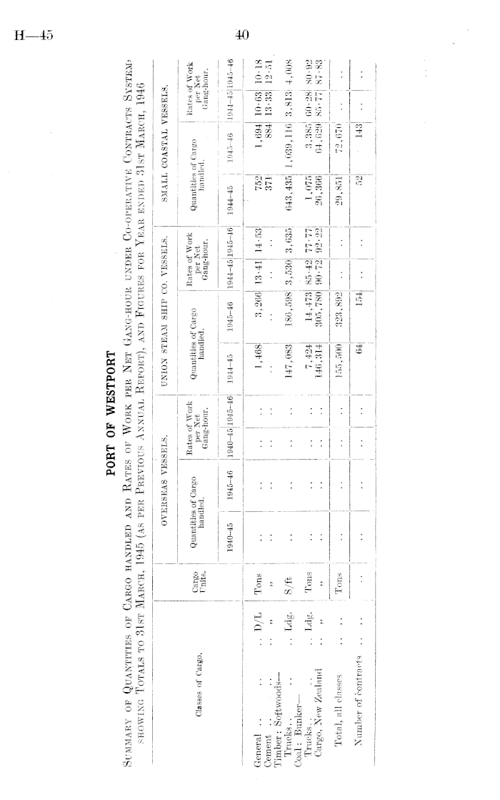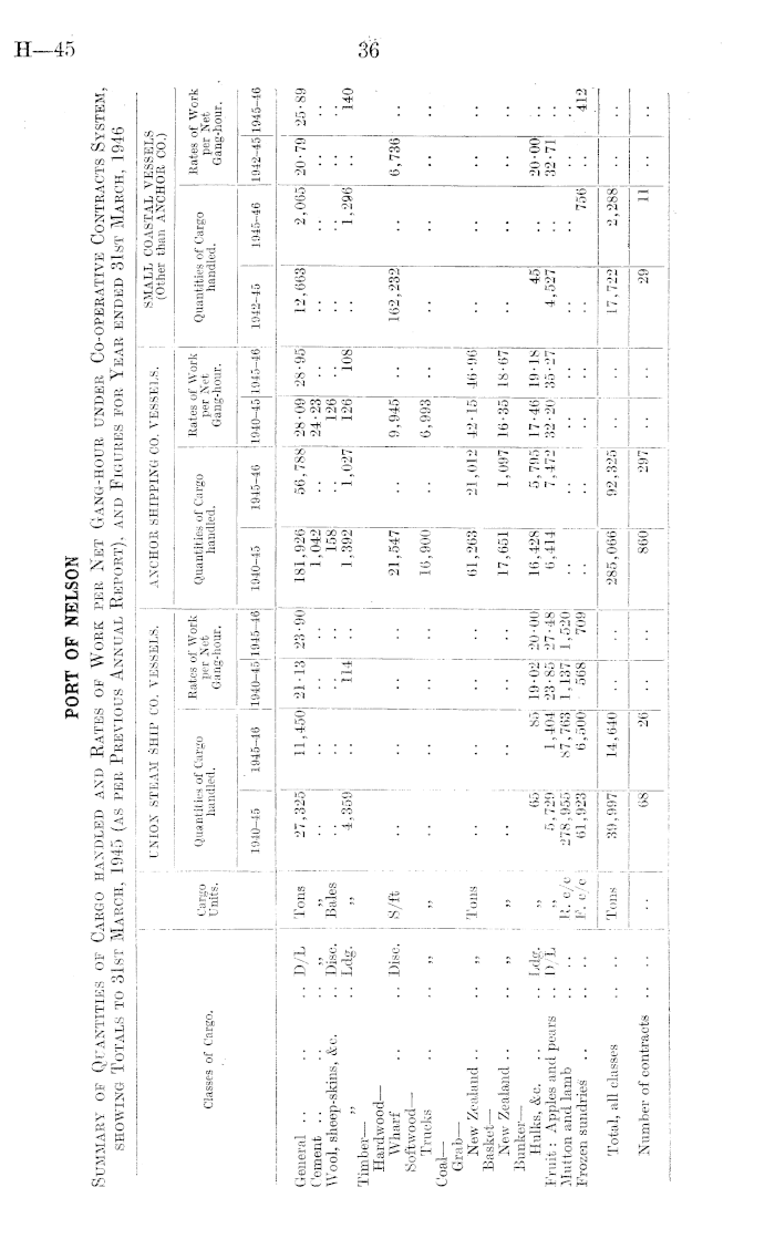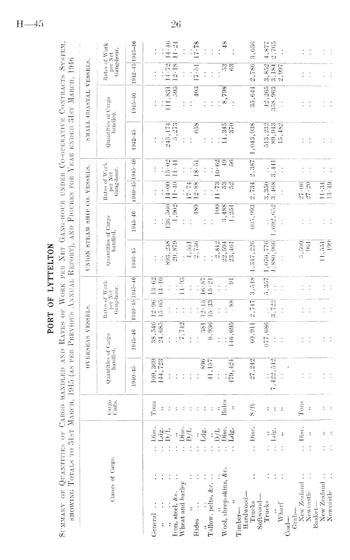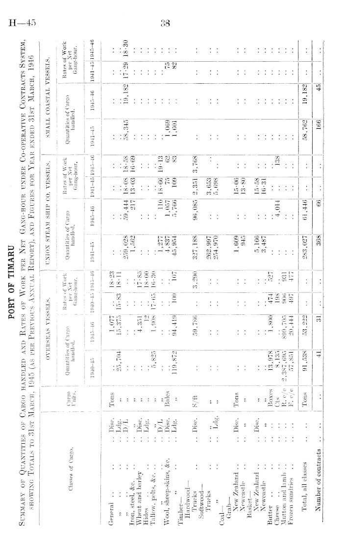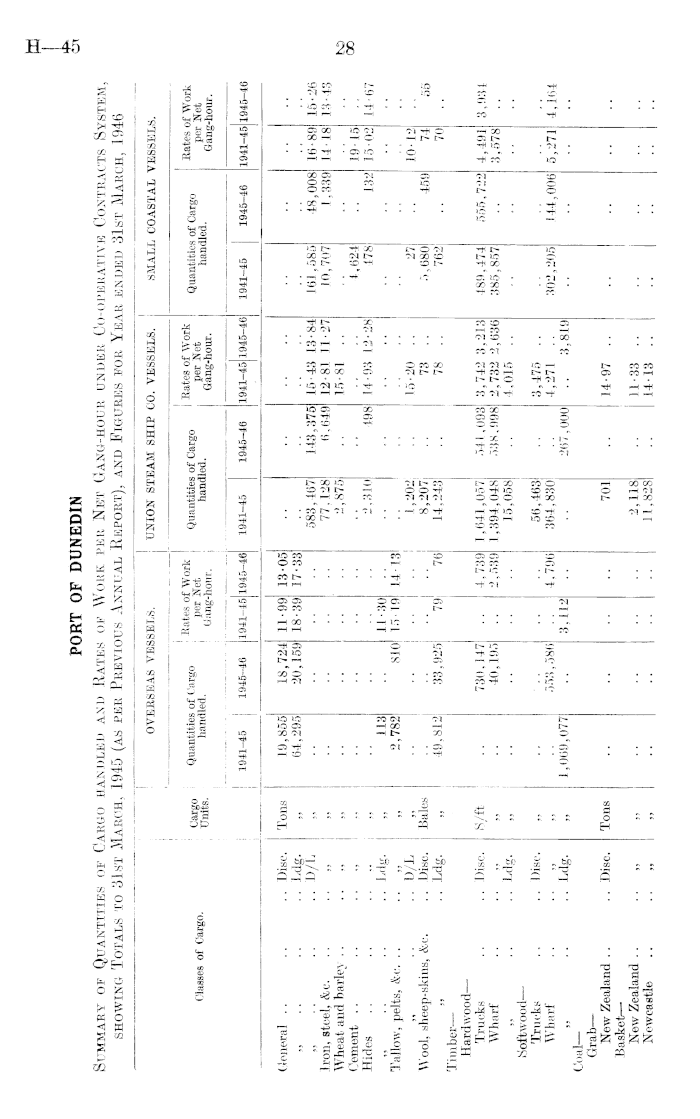 Classes of Cargo. Cargo Units. OVERSEAS VESSELS. UNION STEAM SHIP CO. VESSELS. SMALL COASTAL VESSELS. Quantities of Cargo handled. Bates of Work per Net Gang-hour. Quantities of Cargo handled. Rates of Work per Net Gang-hour. Quantities of Cargo handled. Rates of Work per Net Gang-hour. 1940-45 1945-46 1940-45 1945-46 1940-45 1945-46 1940-45 1945-46 1941-45 1945-46 1941-45 1945-46 General .. .. .. D/L Dolomite.. .. .. Disc. Timber: Softwood — Barges .. „ Total, all classes Number of contracts Tons S/ft •• •• •• 23,335 10,002 6,277,552 4,477 2,780 17-25 12-63 5,649 15-08 14-40 Tons 45,893 7,257 134 17