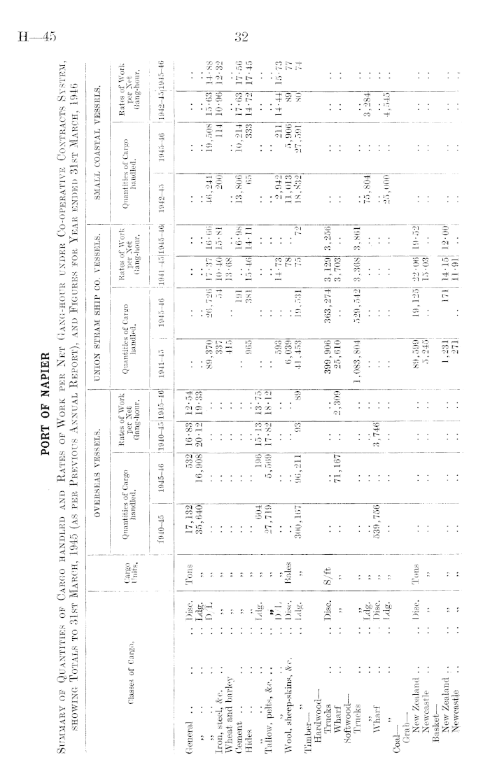 PORT OF NAPIER Summary of Quantities of Cargo handled and Rates of Work per Net Gang-hour under Co-operative Contracts System, showing Totals to 31st March, 1945 (as per Previous Annual Report), and Figures for Year ended 31st March, 1946
