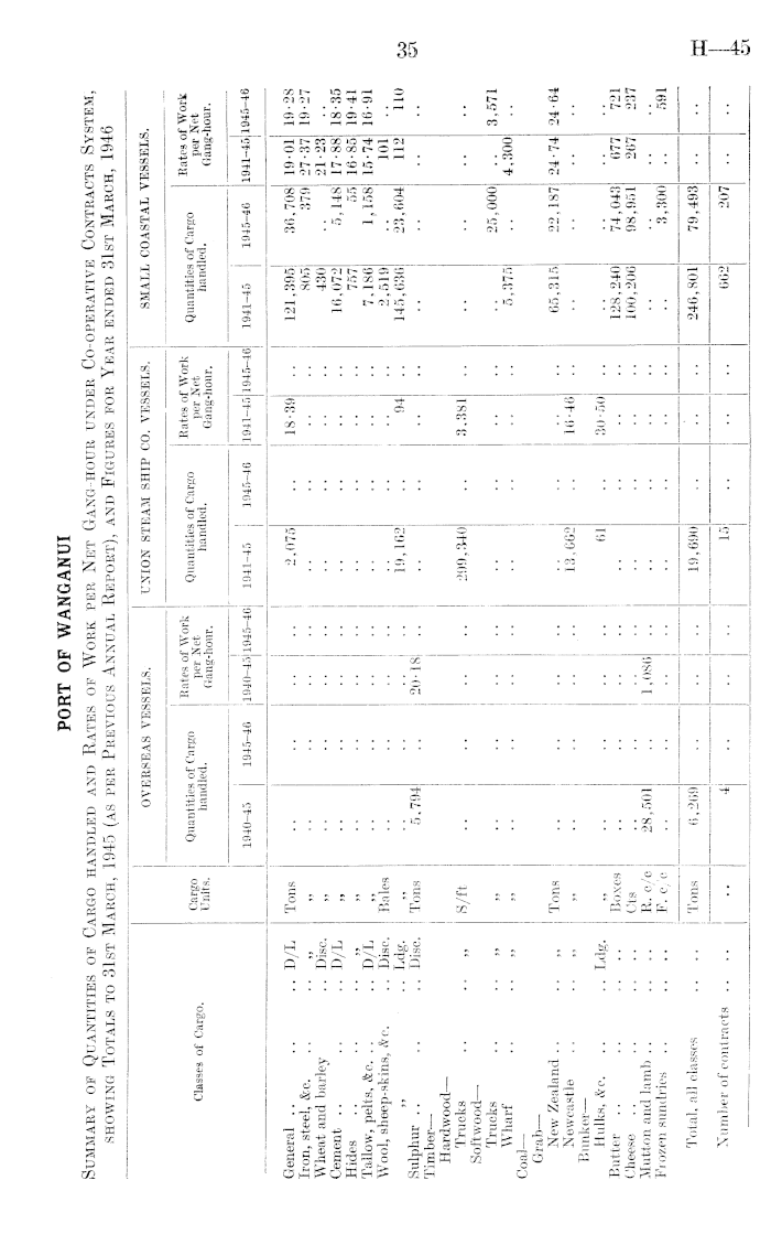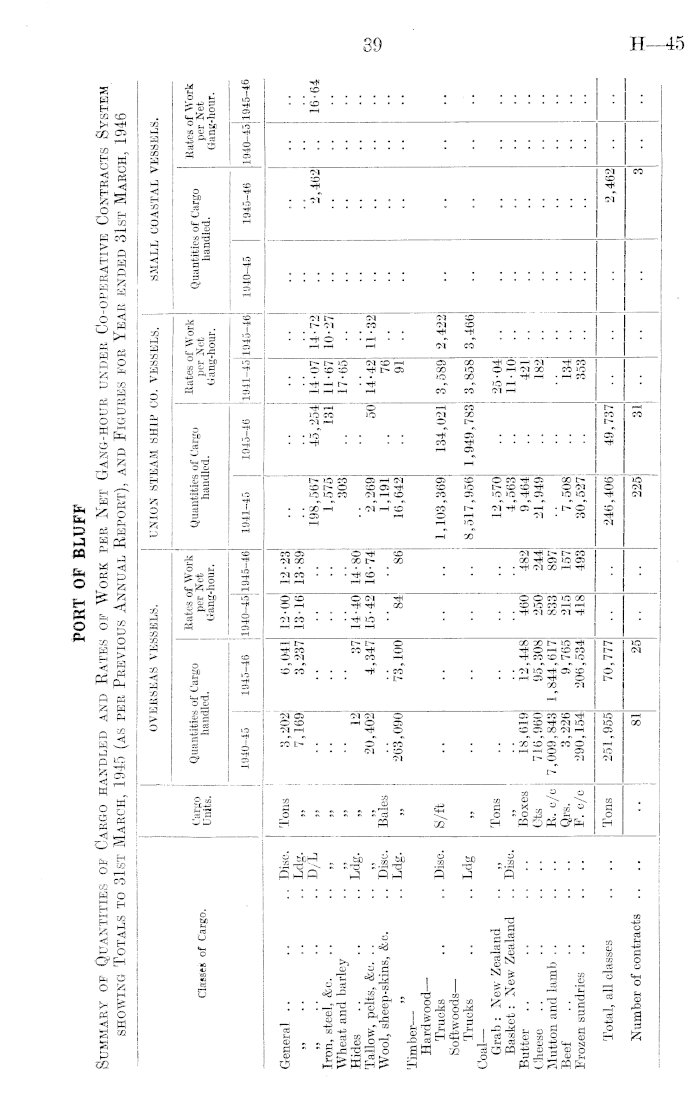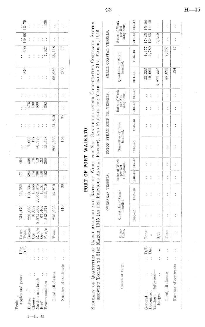 Classes of Cargo. Cargo Units. OVERSEAS VESSELS. UNION STEAM SHIP CO. VESSELS. SMALL COASTAL VESSELS., Quantities of Cargo handled. Rates of Work per Net Gang-hour. Quantities of Cargo handled. Rates of Work per Net Gang-hour. Quantities of Cargo handled. Rates of Work per Net Gang-hour. 1940-45 1945-46 1940-45 1945-46 1944-45 1945-46 1944-45 1945-46 1940-45 1945-46 1940-45 1945-46 General .. .. .. Disc. .. Ldg. .. D/L Lead .. .. .. Ldg. Hides .. .. „ Tallow, pelts, &c. .. ,, Wool, sheep-skins, &c. .. „ Butter .. .. .... Cheese .. .. .... Mutton and lamb .. Frozen sundries Total, all classes Number of contracts Tons 99 99 99 99 Bales Boxes Cts R. c/c F. c/c 20,132 12,754 195 9,286 226,629 7,624 64,401 4,757,788 131,664 3,864 1,504 218 37 1,624 106,816 319 4,273 1,314,328 82,528 11-82 19-93 li *30 14-88 93 548 226 903 439 11-25 8-90 13-88 14-13 80 425 174 788 415 19 8,434 12-67 395 Tons 163,669 48,332 245 78 19 2