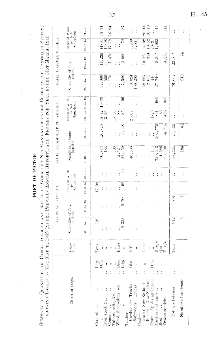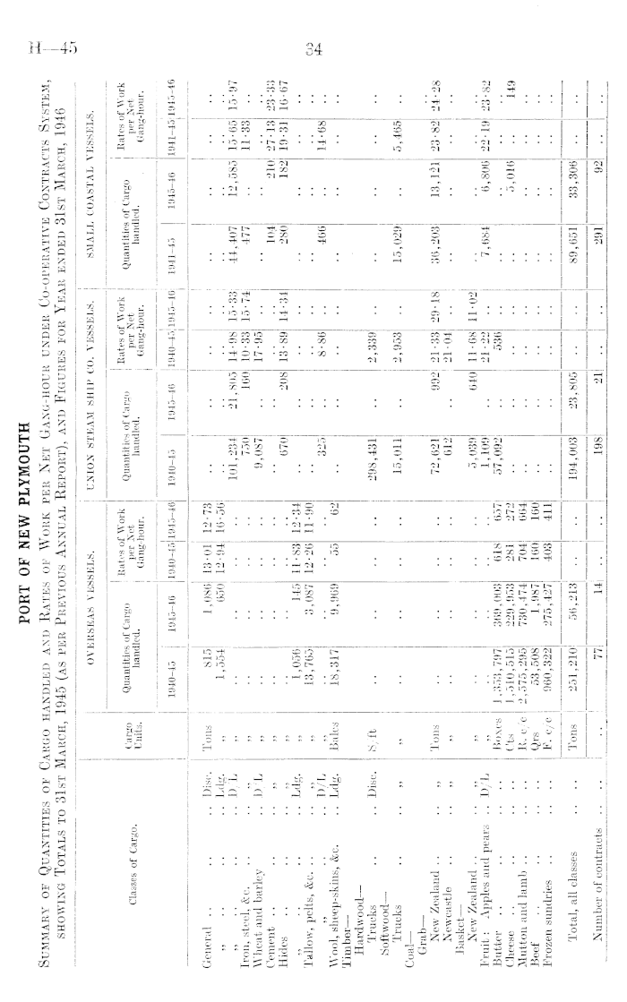PORT OF NEW PLYMOUTH Summary of Quantities of Cargo handled and Rates or Work per Net Gang-hour under Co-operative Contracts System, showing Totals to 31st March, 1945 (as per Previous Annual Report), and Figures for Year ended 31st March, 1946