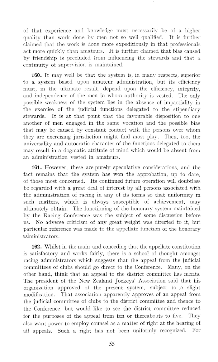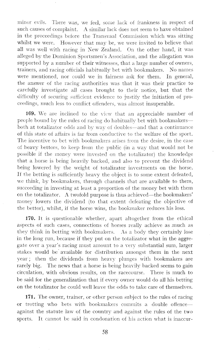 report of the South Australian Royal Commission on Betting of 1932-33, the report of the South Australian Royal Commission on Betting Laws and Practice of 1938, and the report of the Royal Commission appointed in Queensland in 1936 to inquire into matters relating to racing and gaming. We also read with care the reports published in South Africa of the proceedings of the Commission in the Transvaal on racing and betting. This Commission was sitting at the same time as our own Commission. 4. Cases were submitted to us by the New Zealand Racing Conference, the New Zealand Trotting Conference, the Dominion Sportsmen's Association, and by an Association of Churches constituted of the Presbyterian Church of New Zealand, the Methodist Church, the Baptist Church, the Congregational Church, the Church of Christ, the Salvation Army, and the Society of Friends. A case was also submitted to us by the Public and Social Affairs Committee of the Church of the Province of New Zealand, commonly known as the Church of England, whilst, with the approbation of the Roman Catholic Archbishop of Wellington,, evidence was tendered to us by a priest of the Roman Catholic Church on behalf of a number of organizations representative of the social, educational, and charitable activities of that Church at Napier. Evidence was also given before us by an official representative of the Christian Science Church. In addition, we had the advantage of hearing the evidence of a number of individual clergymen and other gentlemen opposed to gambling. 5. The better to enable us to form an opinion upon the nature and extent of the landed and financial interests involved in racing and to enable us to get a more accurate and comprehensive view of many of the other phases of the questions referred to us, we visited most of the racecourses in New Zealand and there met, informally, the people responsible for the administration of the racing on those courses. For the same reasons, we also visited several of the major studs. 6. As the work of the Commission proceeded it became increasingly obvious that two questions would obtrude themselves as of primary importance —firstly, whether gambling is or is not unethical and whether or not it should, in consequence, be repressed by the State to the maximum limit which the moral standards of the community will from time to time permit; and, secondly, whether bookmakers should be licensed to carry on their businesses not upon the racecourses of the country, but in premises to which members of the public are denied all physical access. 7. In close association with the latter question and in consequence of it, the question was raised as to whether facilities should be authorized by law for off-course betting on the totalizator.