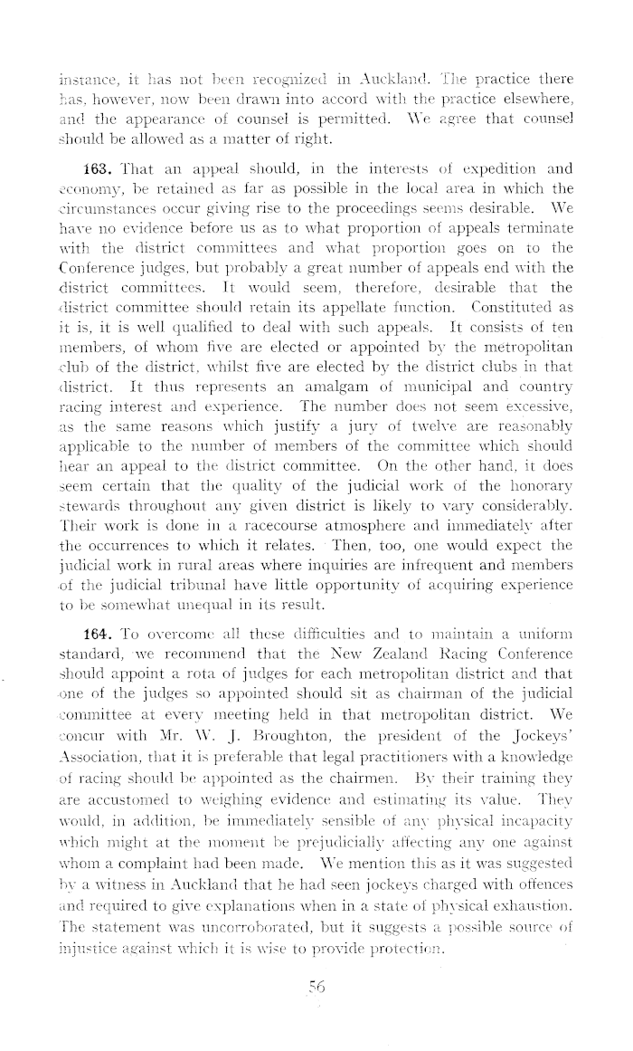 Legalization of newspaper tipping (Part VII, Section 1), Publication of dividends (Part VII, Section 2), Overseas lotteries (Part IX Section 3) Amendments of Gaming Act, 1908, dealt with in Part X, cannot be given effect without legislation. 413. Restriction or suppression of illegal off-course betting carried on through the telephone service (Part 11, Section 3) : It is possible that there may be sufficient authority in the Post and Telegraph Act, 1928, to deal with this matter in the manner recommended by us. If not, the Act should be amended to take such power. 414. The Racing Advisory Board (Part 111, .Section 5) can initially be constituted by Ministerial action, and we recommend that this be done, as its functions are those of an adviser to the Minister, who will have power to withhold or cancel totalizator licences. In due course, however, statutory recognition should be given. 415. The ss. totalizator (Part IV, Section 10) can be established without legislation, but when an amendment of the Gaming Act is brought down provision should be made, as we have recommended, for the fraction to be reduced from 6d. to 3d. CONCLUSION 416. We cannot conclude our report without expressing our thanks to the counsel who appeared before us, and particularly to those who represented major cases—namely, Messrs. Donnelly and Blundell, who appeared for the Racing Conference ; Messrs. Thomas and Lee, who appeared for the Trotting Conference ; Mr. Leicester, who appeared for the Dominion Sportsmen's Association ; Dr. Mazengarb and Mr. Marshall, who appeared for the associated Churches. To Messrs. Donnelly and Thomas we are signally indebted for their ready response to every request made by us for information or help. 417. We are also desirous of expressing our thanks to Miss Will and Messrs. Conway and Edwards for the accuracy and celerity with which they took and reproduced the record of our proceedings and for the spirit of ready co-operation which they at all times exhibited. To our secretary, Mr. W. M. Bolt, our thanks and gratitude are particularly due. His wide knowledge and experience of racing and his great organizing and administrative ability were always at our service. Indeed, our task without him would have been unenviable indeed. We have the honour to be, Your Excellency's most obedient servants, G. P. Finlay (Chairman). W. H. Freeman. J. W. Heenan.