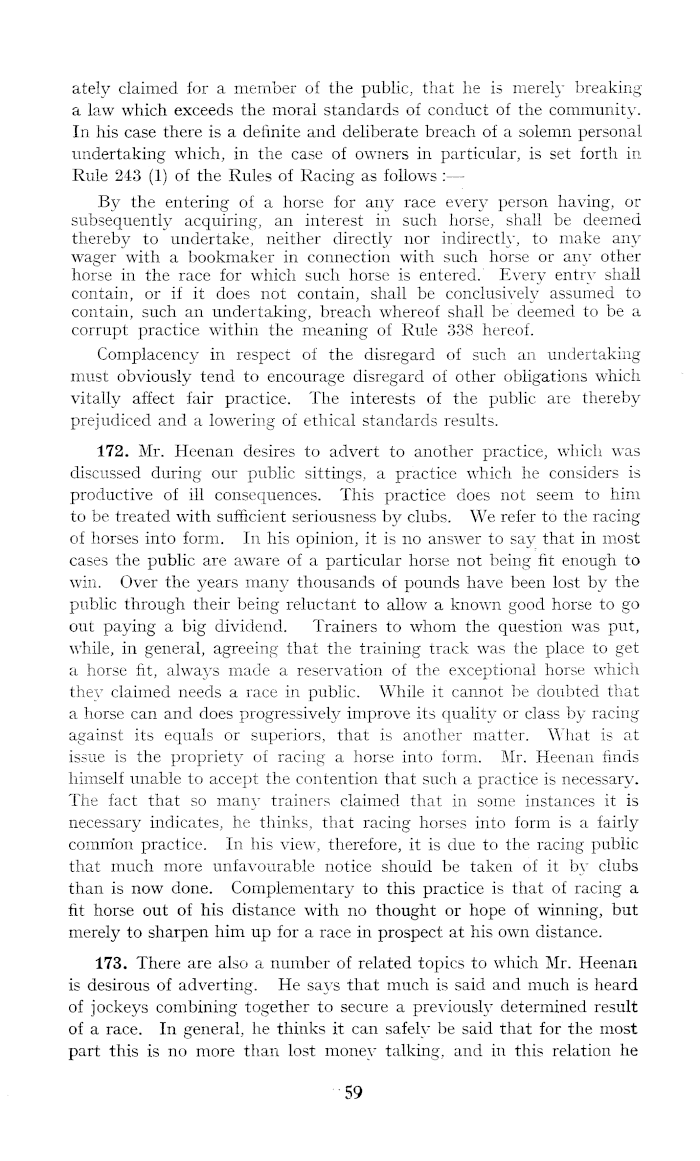PART VII.—MISCELLANEOUS MATTERS CONNECTED WITH RACING AND BETTING SECTION I.—TIPPING 349. Probably no penal provision of the Gaming Act, 1908, is more consistently flaunted or more successfully evaded than that part of section 30 which purports to prohibit tipping—i.e., the giving of " advice as to the probable result of any horse-race." In its application to the professional tipster who advertises his calling, the section has had a salutary effect, and, as a class, these men have long since disappeared. As a means, however, of preventing newspaper tipping, it has increasingly become a dead letter. All newspapers regularly give for each race on every programme a summary comprising two or three " horses in form " or horses " likely to be favoured in the betting." Some of them go so far in their final issues before big meetings as to print a comparative table setting out their own selections alongside those of other papers. 350. In recent years, too, a number of publications registered as newspapers have come into being and are openly sold which consist almost entirely of lists of acceptors for races with figures indicating their recent performances, and the names of those considered likely to win or run into places. We have not heard of any daily or weekly newspaper or any of the pseudo-newspapers ever being prosecuted. We do not think that the practice induces a desire to bet that would otherwise be absent; on the other hand, if it does anything at all it, in our opinion, causes racegoers to give more thought to form probabilities than to mere fancies. To the extent that it makes available to the public at large the conclusions and opinions of trained and professional observers whose reputations are to some extent involved it serves a useful purpose. In any event, the form and performances of racehorses is news in a very real sense, and we can see nothing to be gained and much to be lost by suppressing its publication. Only ill consequences accrue from the uncertainty and mystery which suppression engenders. We think, therefore, that the public should be told in an open and public way all that is to be told concerning horses and their form. 351. We therefore recommend that section 30 be amended to permit of newspaper tipping. Care should, however, be taken to avoid the possibility of the individual advertising tipster ever again emerging. He and all who offer tips for direct personal gains should be rigorously excluded. 352. Anything in the nature of tipping over the broadcast system is not recommended. On the contrary, we think it should be specifically prohibited.