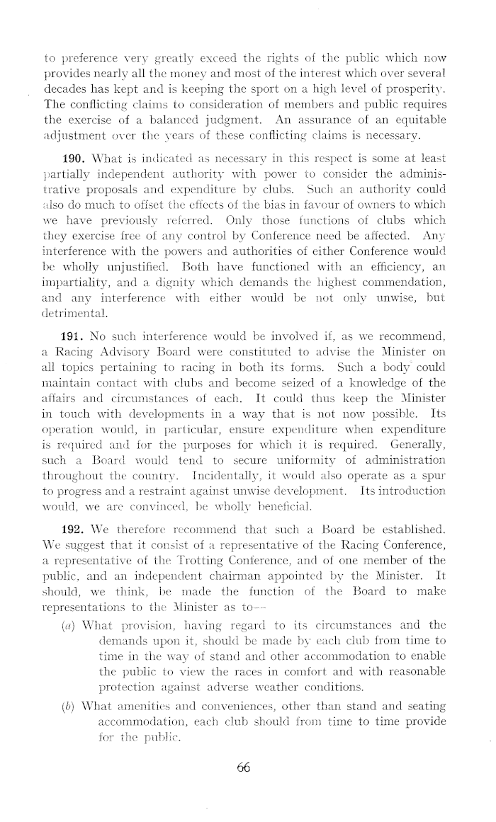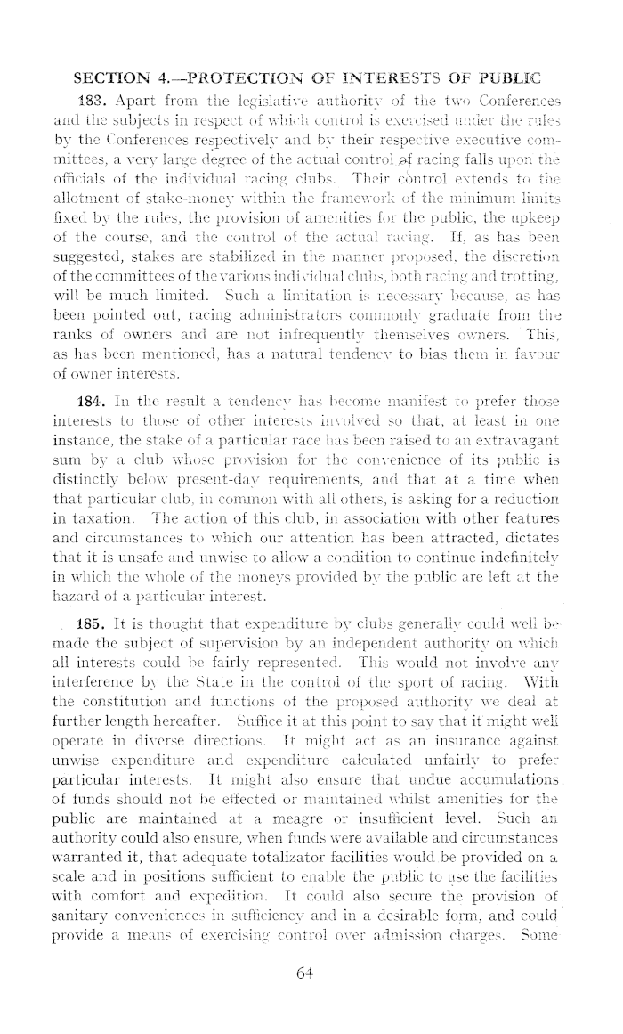 on advertised lists so that each horse, wherever racing on that day, will have its own distinctive number. Thus, as Mr. Brady says, the date of the race, the name of the issuing-office, the horse's number, and the amount of the bet are the only details that need appear on any ticket. Where a horse is entered in two or more races or at two or more meetings it is to bear different numbers for each race for which it is entered, Then, by synchronizing the starting-times of all races, the administration of the scheme is simplified. The proposal is that all first races should commence at the same hour, as should all second and subsequent races. By this system booth clerks will know on what races they can and on what they cannot take bets as the day proceeds. The dividends to be paid on all off-course bets are to be the dividends declared on the totalizator controlled by the club responsible for the running of the race to which the betting relates. Mr. Brady conceives, however, that some limits would have to be imposed, and he suggests that £2O be the maximum dividend for a win and £5 for a place in the case of galloping races, and £8 for a win and £3 for a place in respect of all trotting horses. 101. It will be seen from this recital of the proposal that Mr. Brady's scheme involves the State being required to embark in business as a bookmaker upon a national scale. The character of the scheme in this respect is made still more emphatic by the suggestion that doubles betting should be provided for at odds determined by the responsible governmental authority. This scheme also is open to the gravest objection. The betting-booths which it is proposed to establish will, from their initiation, be nothing more nor less than betting-shops. For not only are bets to be taken in them, but dividends are to be paid there immediately after each race. As compared with any scheme by which moneys are to pass through racecourse totalizators, the scheme involves a substantial loss of revenue to racing clubs and a loss of taxation to the Crown, for both the clubs and the State are required to predetermine the revenue they expect from betting, and it is only in so far as the predetermined amounts are not satisfied by the totalizators on the racecourses that contribution is to be levied on the moneys adventured in the off-course system. The predetermination of revenue which is suggested will inevitably create difficulty, for there is nothing in the scheme suggesting any limitation on or any control of the right of predetermination. Excessive assessments may therefore be expected. 102. The restriction on the income of racing clubs is imposed in order to provide for the creation of a fund for annual distribution amongst those who have made losing bets. In addition, the scheme involves the stabilization of racecourse amenities at their present standard except upon a few principal courses. This suggestion is frankly based upon the assumption that outside patrons of racecourses get few amenities