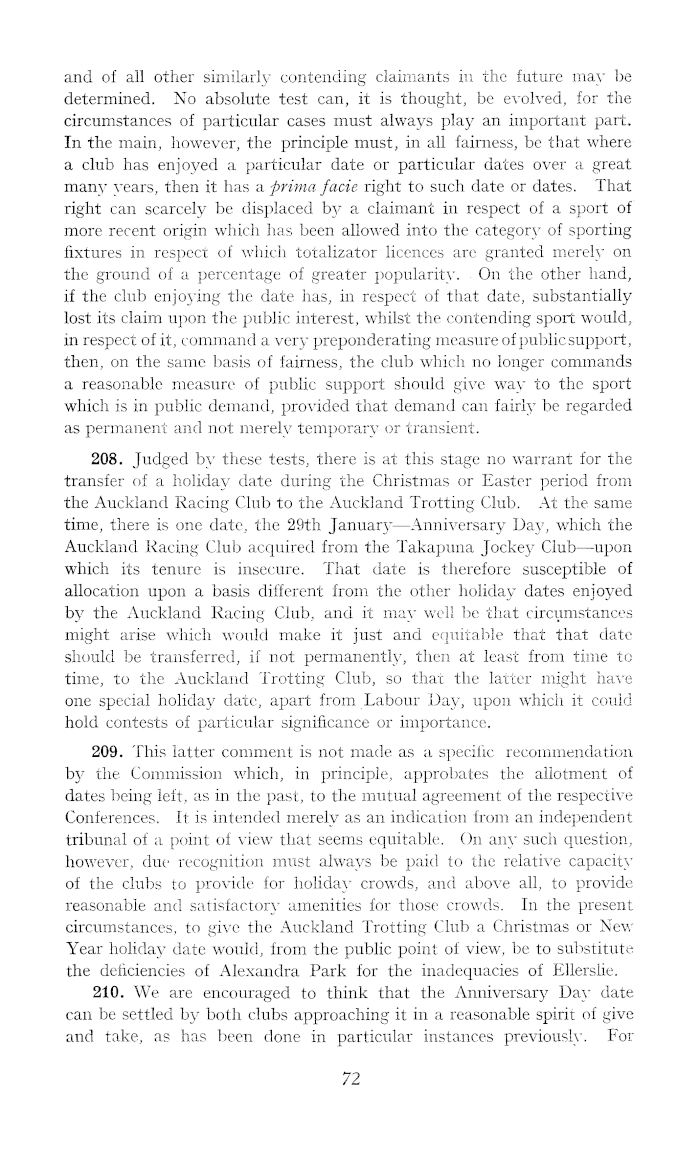 347. These are moneys to which, as we have said, the clubs have a legal title, but they are in the nature of " windfalls " to the clubs, and out of them a reasonable contribution to the enjoyment of the sport from which they arise by those whose opportunities of enjoying it would otherwise be very restricted seems equitable. The amount of the levy payable by any club would not be considerable, for, although there are many picnic meetings, the prizes offered are everywhere inconsiderable. 348. We do not think any picnic clubs organized in the future should take any benefit from the proposal, except the clubs mentioned in the First Schedule hereto should they decide to continue in existence as non-totalizator or picnic racing clubs. There are enough such clubs now, and one has already sprung up anywhere that the necessity for it exists or is likely to exist for many years.
