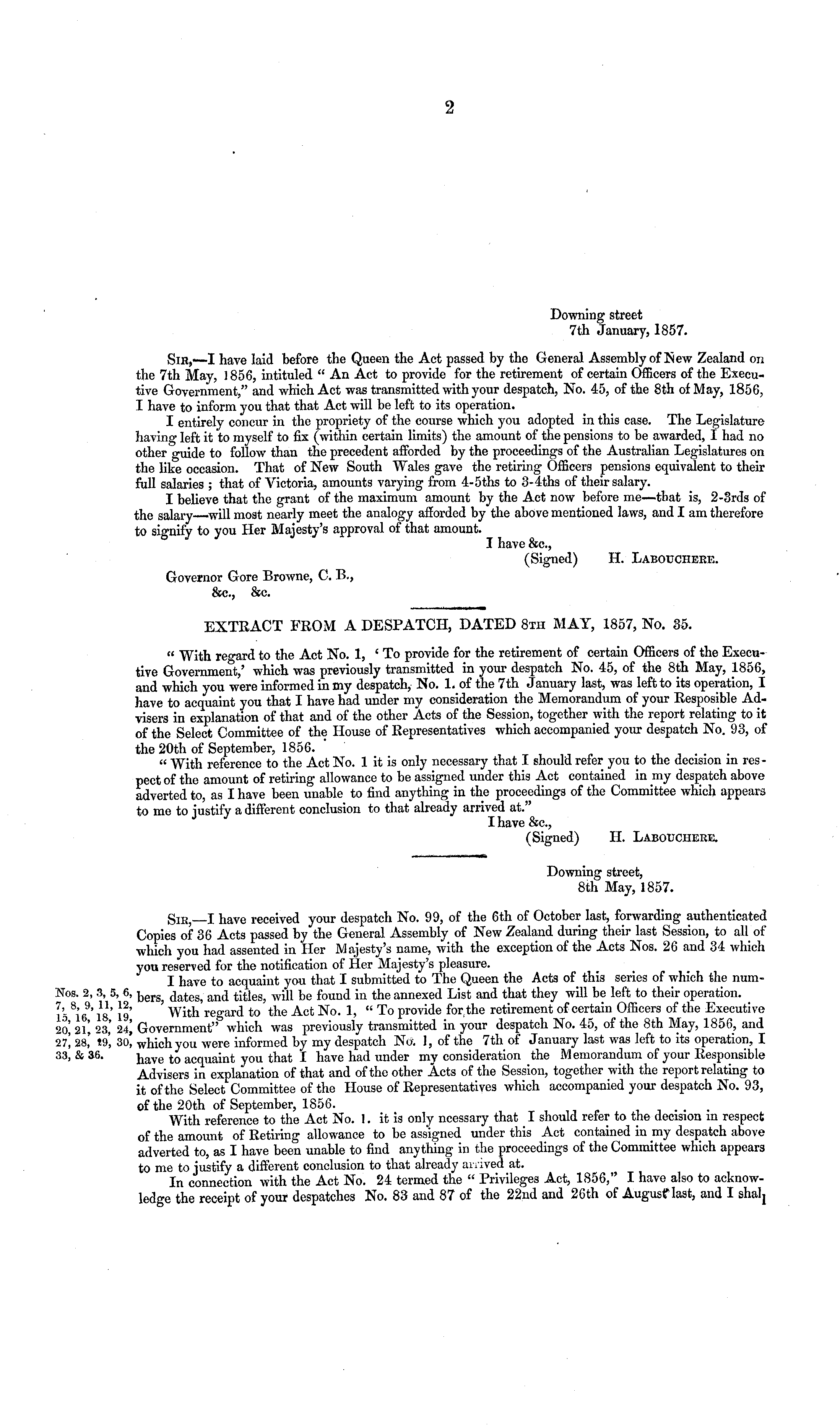 Downing street 7th January, 1857. Sir, —I have laid before the Queen the Act passed by the General Assembly of New Zealand on the 7th May, 1856, intituled " An Act to provide for the retirement of certain Officers of the Executive Government," and which Act was transmitted with your despatch, No. 45, of the Bth of May, 1856, I have to inform you that that Act will be left to its operation. I entirely concur in the propriety of the course which you adopted in this case. The Legislature having left it to myself to fix (within certain limits) the amount of the pensions to be awarded, I had no other guide to follow than the precedent afforded by the proceedings of the Australian Legislatures on the like occasion. That of New South Wales gave the retiring Officers pensions equivalent to their full salaries ; that of Victoria, amounts varying from 4-sths to 3-4ths of their salary. I believe that the grant of the maximum amount by the Act now before me—that is, 2-3rds of the salary will most nearly meet the analogy afforded by the above mentioned laws, and lam therefore to signify to you Her Majesty's approval of that amount. I have &c, (Signed) H. Labouchere. Governor Gore Browne, C. 8., &c., &c. EXTRACT FROM A DESPATCH, DATED Bth MAY, 1857, No. 35. " With regard to the Act No. 1, 'To provide for the retirement of certain Officers of the Executive Government,' which was previously transmitted in your despatch No. 45, of the Bth May, 1856, and which you were informed in my despatch, No. 1. of the 7th January last, was left to its operation, I have to acquaint you that I have had under my consideration the Memorandum of your Resposible Advisers in explanation of that and of the other Acts of the Session, together with the report relating to it of the Select Committee of the House of Representatives which accompanied your despatch No. 93, of the 20th of September, 1856. ' „.,... " With reference to the Act No. 1 it is only necessary that I should refer you to the decision in res - pect of the amount of retiring allowance to be assigned under this Act contained in nry despatch above adverted to, as I have been unable to find anything in the proceedings of the Committee which appears to me to justify a different conclusion to that already arrived at." I have &c, (Signed) H. Labouchere. Downing street, Bth May, 1857. Sir,—l have received your despatch No. 99, of the 6th of October last, forwarding authenticated Copies of 36 Acts passed by the General Assembly of New Zealand during their last Session, to all of which you had assented in Her Majesty's name, with the exception of the Acts Nos. 26 and 34 which you reserved for the notification of Her Majesty's pleasure. I have to acquaint you that I submitted to The Queen the Acts of this series of which the numNos. 2, 3, 5, 6, dateg) an( j tit i og; w ;u be found in the annexed List and that they will be left to their operation. 15 \£ 18' 19' ' Wit& re g ar d to tne Act No - 1 ' "To P rovide for the retirement of certain Officers of the Executive 2oi 21, 23,' 24J Government" which was previously transmitted in your despatch No. 45, of the Bth May, 1856, and 27! 2s' t9, 30) which you were informed by my despatch No. 1, of the 7th of January last was left to its operation, I 33, &36. have to acquaint you that I have had under my consideration the Memorandum of your Responsible Advisers in explanation of that and of the other Acts of the Session, together with the report relating to it of the Select Committee of the House of Representatives which accompanied your despatch No. 93, of the 20th of September, 1856. ..... With reference to the Act No. 1. it is only ncessary that I should refer to the decision m respect of the amount of Retiring allowance to be assigned under this Act contained in my despatch above adverted to, as I have been unable to find anything in the proceedings of the Committee which appears to me to justify a different conclusion to that already ar.ived at. In connection with the Act No. 24 termed the " Privileges Act, 1856," I have also to acknowledge the receipt of your despatches No. 83 and 87 of the 22nd and 26th of August last, and I shalj