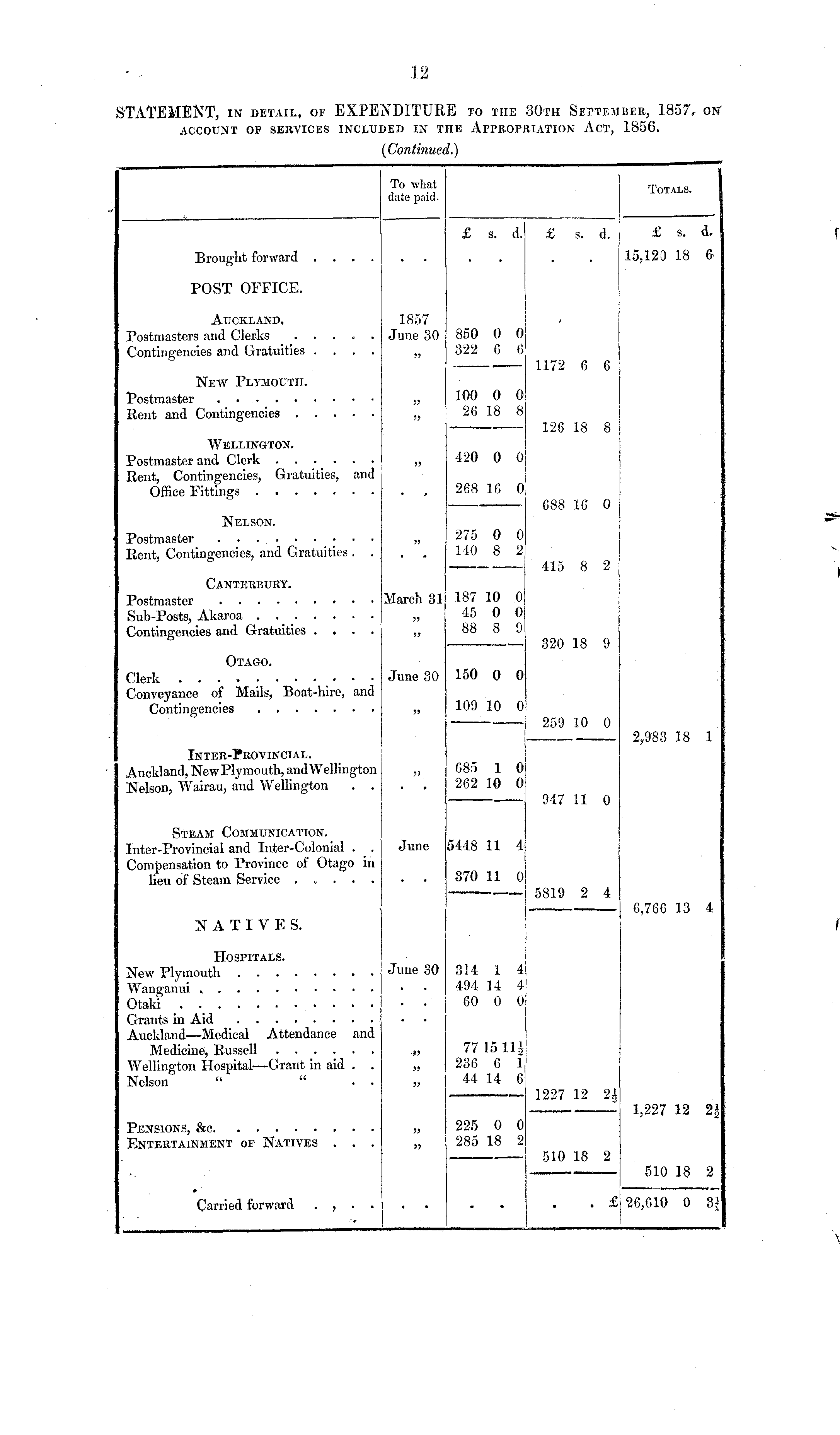 To what dute paid. Totals. £ s. (!. £ s. d. £ s. d. Brought forward .... 15,120 18 6 POST OFFICE. 1857 June 30 Auckland, Postmasters and Clerks Contingencies and Gratuities .... 850 0 0! 322 C 6 i J5 1172 6 6 New Plymouth. 100 0 0 26 18 8 Postmaster Rent and Contingencies )? Wellington. Postmaster and Clerk Rent, Contingencies, Gratuities, and Office Fittings ;j 126 18 8 )> 420 0 0j 268 16 0 i 688 16 0 Nelson. jj 275 0 0 140 8 2 Postmaster Rent, Contingencies, and Gratuities . . 415 8 2 Canterbury. i Postmaster Sub-Posts, Akaroa Contingencies and Gratuities .... March 31 187 10 0 45 0 0 88 8 9 J5 55 320 18 9 Otago. June 30 150 0 0 Clerk Conveyance of Mails, Boat-hire, and Contingencies j> 109 10 0 259 10 0 Inter-Provincial. Auckland, New Plymouth, and Wellington Nelson, Wairau, and Wellington . . 2,983 18 1 )> 685 1 0 262 10 0 Steam Communication. Inter-Provincial and Inter-Colonial . . Compensation to Province of Otago in lieu of Steam Service ..... 947 11 0 June 5448 11 4 370 11 0 5819 2 4 G,7GG 13 4 NATIVES. Hospitals. New Plymouth Wanganui Otaki Grants in Aid Auckland—Medical Attendance and Medicine, Russell Wellington Hospital —Grant in aid . . Nelson " . . June 30 314 1 4 494 14 4 60 0 0 :•> 77 15 llj 236 6 1 44 14 6 i> J? _—_—^— 1227 12 2-1 Pensions, &c Entertainment op Natives . . . )5 225 0 0 285 18 2 1,227 12 n ?3 510 18 2 510 18 2 i> * • Carried forward . , . . • £ -26,010 0 H