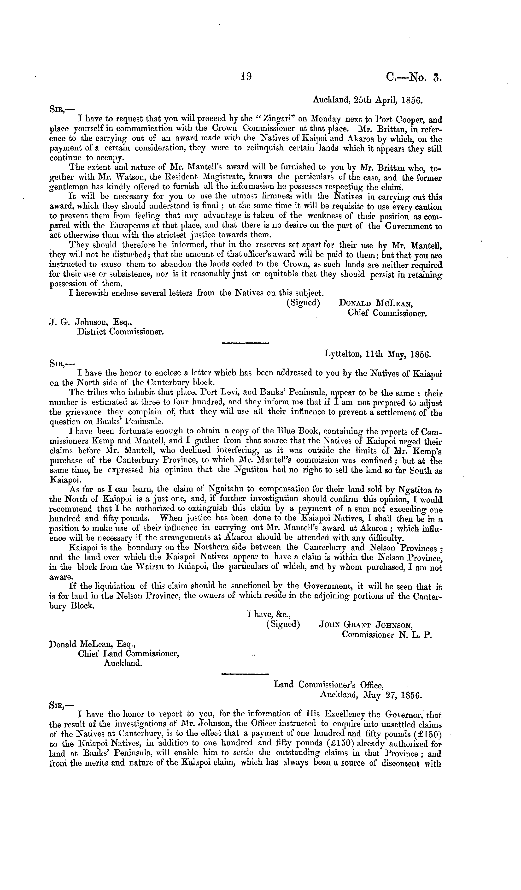 Auckland, 25th April, 1856. Sir,— I have to request that you will proceed by the " Zingari" on Monday next to Port Cooper, and place yourself in communication with the Crown Commissioner at that place. Mr. Brittan, in reference to the carrying out of an award made with the Natives of Kaipoi and Akaroa by which, on the payment of a certain consideration, they were to relinquish certain lands which it appears they still, continue to occupy. The extent and nature of Mr. Mantell's award will be furnished to you by Mr. Brittan who, together with Mr. Watson, the Kesident Magistrate, knows the particulars of the case, and the former gentleman has kindly offered to furnish all the information he possesses respecting the claim. It will be necessary for you to use the utmost firmness with the Natives in carrying out this award, which they should understand is final ; at the same time it will be requisite to use every caution to prevent them from feeling that any advantage is taken of the weakness of their position as compared with the Europeans at that place, and that there is no desire on the part of the Government to act otherwise than with the strictest justice towards them. They should therefore be informed, that in the reserves set apart for their use by Mr. Mantell, they will not be disturbed; that the amount of that officer's award will be paid to them; but that you are instructed to cause them to abandon the lands ceded to the Crown, as such lands are neither required for their use or subsistence, nor is it reasonably just or equitable that they should persist in retaining possession of them. I herewith enclose several letters from the Natives on this subject. (Signed) Donald McLean, Chief Commissioner. J. G. Johnson, Esq., District Commissioner. Lyttelton, 11th May, 1856. Sir, — I have the honor to enclose a letter which has been addressed to you by the Natives of Kaiapoi on the North side of the Canterbury block. The tribes who inhabit that place, Port Levi, and Banks' Peninsula, appear to be the same ; their number is estimated at three to four hundred, and they inform me that if I am not prepared to adjust the grievance they complain of, that they will use all their influence to prevent a settlement of the question on Banks' Peninsula. I have been fortunate enough to obtain a copy of the Blue Book, containing , the reports of Commissioners Kemp and Mantell, and I gather from that source that the Natives of Kaiapoi urged their claims before Mr. Mantell, who declined interfering, as it was outside the limits of Mr. Kemp's purchase of the Canterbury Province, to which Mr. Mantell's commission was confined ; but at the same time, he expressed his opinion that the Ngatitoa had no right to sell the land so far South as Kaiapoi. As far as I can learn, the claim of Ngaitahu to compensation for their land sold by Ngatitoa to the North of Kaiapoi is a just one, and, if further investigation should confirm this opinion, I would recommend that I be authorized to extinguish this claim by a payment of a sum not exceeding one hundred and fifty pounds. When justice has been done to the Kaiapoi Natives, I shall then be in a position to make use of their influence in carrying out Mr. Mantell's award at Akaroa ; which influence will be necessary if the arrangements at Akaroa should be attended with any difficulty. Kaiapoi is the boundary on the Northern side between the Canterbury and Nelson Provinces ; and the land over which the Kaiapoi Natives appear to luve a claim is within the Nelson Province, in the block from the Wairau to Kaiapoi, the particulars of which, and by whom purchased, I am not aware. If the liquidation of this claim should be sanctioned by the Government, it will be seen that it is for land in the Nelson Province, the owners of which reside in the adjoining portions of the Canterbury Block I have, &c, (Signed) John Grant Johnson, Commissioner N. L. P. Donald McLean, Esq., Chief Land Commissioner, Auckland. Land Commissioner's Office, Auckland, May 27, 1856. Sir,— I have the honor to report to you, for the information of His Excellency the Governor, that the result of the investigations of Mr. Johnson, the Officer instructed to enquire into unsettled claims of the Natives at Canterbury, is to the effect that a payment of one hundred and fifty pounds (£150) to the Kaiapoi Natives, in addition to one hundred and fifty pounds (£150) already authorized for land at Banks' Peninsula, will enable him to settle the outstanding claims in that Province ; and from the merits and nature of the Kaiapoi claim, which has always been a source of discontent with