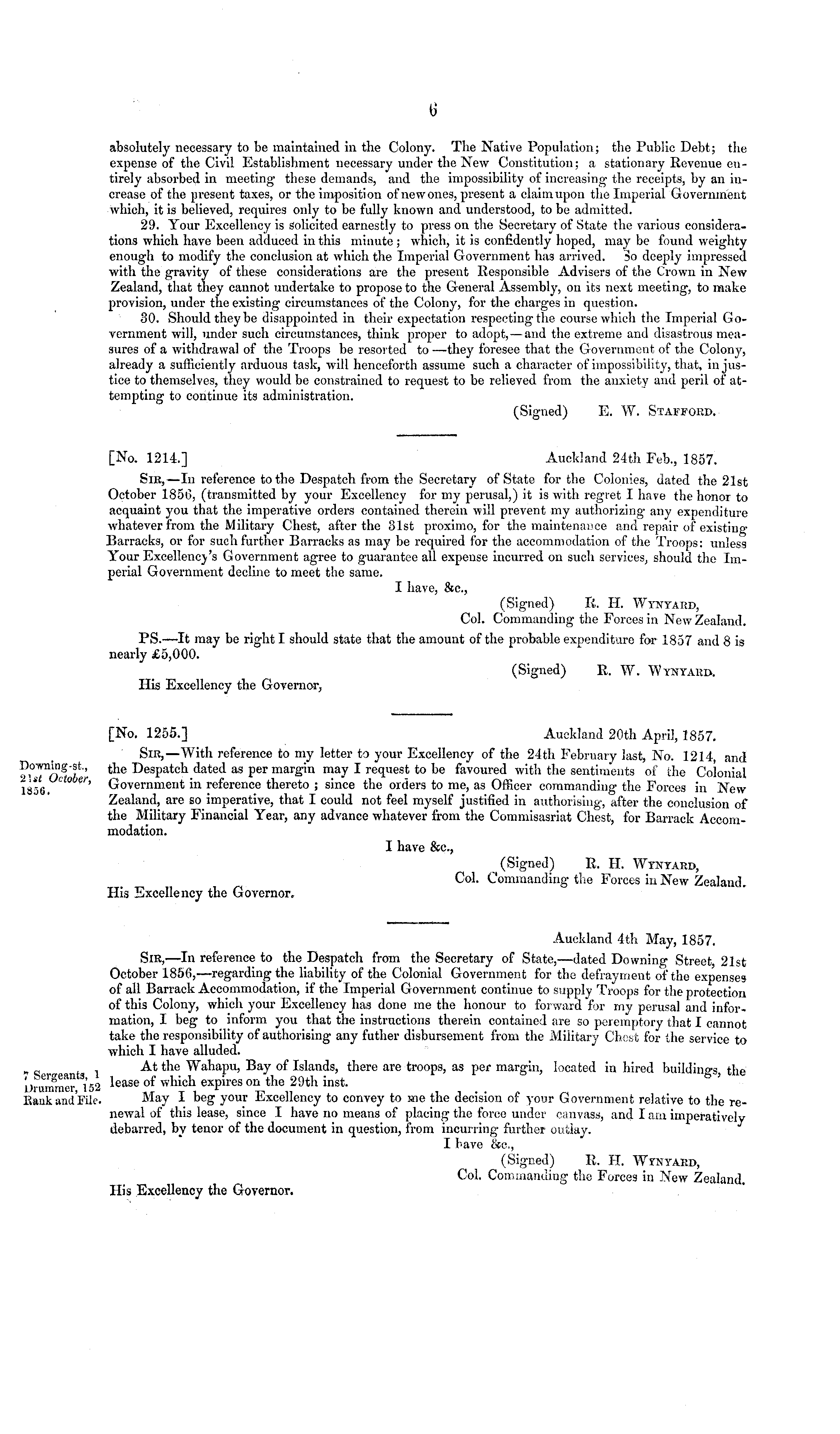 Auckland 4th May, 1857. Sir,—In reference to the Despatch from the Secretary of State,—dated Downing Street, 21st October 1856,—regarding the liability of the Colonial Government for the defrayment of the expenses of all Barrack Accommodation, if the Imperial Government continue to supply Troops for the protection of this Colony, which your Excellency has done me the honour to forward for my perusal and information, I beg to inform you that the instructions therein contained are so peremptory that I cannot take the responsibility of authorising any futher disbursement from the Military Chest for the service to which I have alluded. At the Wahapu, Bay of Islands, there are troops, as per margin, located in hired buildings the leaSe ° f wWch eX P ireS ° n the 29th inst May I beg your Excellency to convey to me the decision of your Government relative to the renewal of this lease, since I have no means of placing the force under canvass, and lam imperatively debarred, by tenor of the document in question, from incurring further outlay. I have &c, (Signed) R. H. Wynyard, Col. Commanding the Forces in New Zealand. His Excellency the Governor.