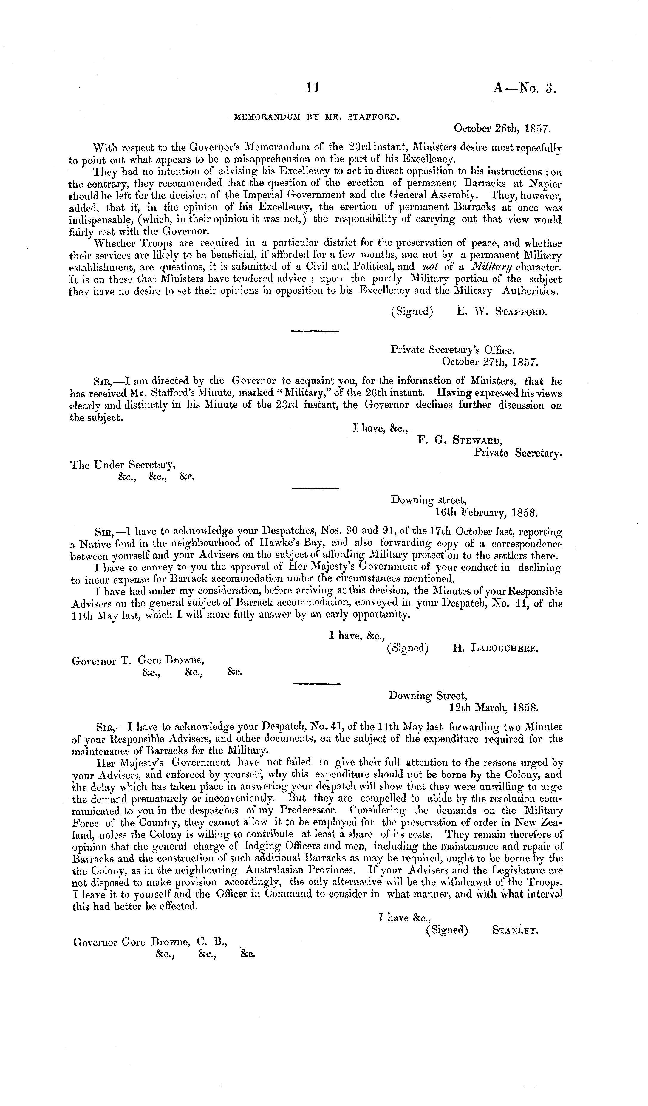 Downing Street, 12th March, 1858. Sir, —I have to acknowledge your Despatch, No. 41, of the 11th May last forwarding two Minutes of your Responsible Advisers, and other documents, on the subject of the expenditure required for the maintenance of Barracks for the Military. Her Majesty's Government have not failed to give their full attention to the reasons urged by your Advisers, and enforced by yourself, why this expenditure should not be borne by the Colony, and the delay which has taken place in answering your despatch will show that they were unwilling to urge the demand prematurely or inconveniently. But they are compelled to abide by the resolution communicated to you in the despatches of my Predecessor. Considering the demands on the Military Force of the Country, they cannot allow it to be employed for the pi eservation of order in New Zealand, unless the Colony is willing to contribute at least a share of its costs. They remain therefore of opinion that the general charge of lodging Officers and men, including the maintenance and repair of Barracks and the construction of such additional Barracks as may be required, ought to be borne by the the Colony, as in the neighbouring Australasian Provinces. If your Advisers and the Legislature are not disposed to make provision accordingly, the only alternative will be the withdrawal of the Troops. I leave it to yourself and the Officer in Command to consider in what manner, and with what interval this had better be effected. T have &c, (Signed) Stanley. Governor Gore Browne, C. 8., &c. ; &c, &c.