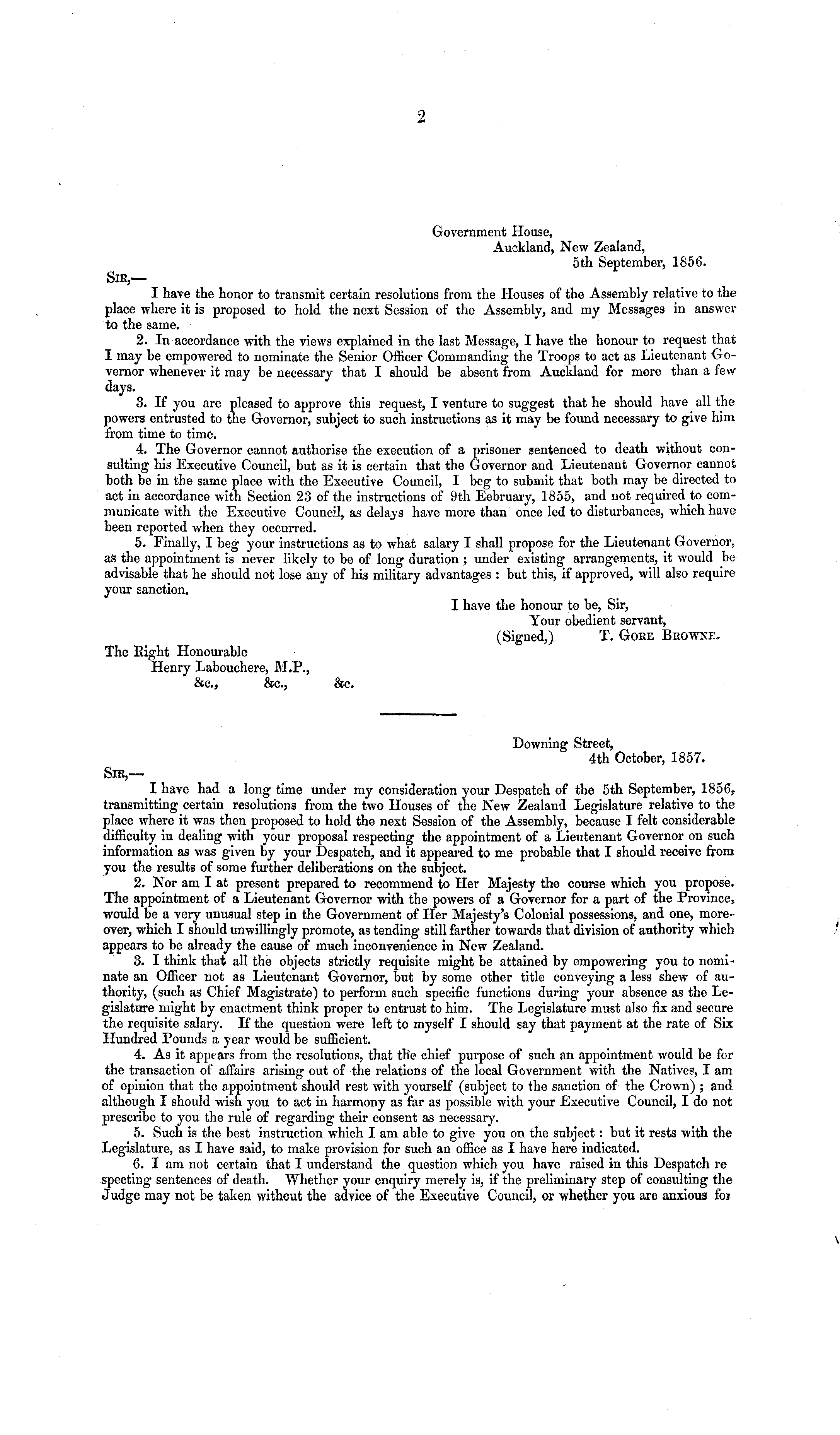 Government House, Auckland, New Zealand, sth September, 1856. Sir,— I have the honor to transmit certain resolutions from the Houses of the Assembly relative to the place where it is proposed to hold the next Session of the Assembly, and my Messages in answer to the same. 2. In accordance with the views explained in the last Message, I have the honour to request that I may be empowered to nominate the Senior Officer Commanding the Troops to act as Lieutenant Governor whenever it may be necessary that I should be absent from Auckland for more than a few days. 3. If you are pleased to approve this request, I venture to suggest that he should have all the powers entrusted to the Governor, subject to such instructions as it may be found necessary to give him from time to time. 4. The Governor cannot authorise the execution of a prisoner sentenced to death without consulting his Executive Council, but as it is certain that the Governor and Lieutenant Governor cannot both be in the same place with the Executive Council, I beg to submit that both may be directed to act in accordance with Section 23 of the instructions of 9th Eebruary, 1855, and not required to communicate with the Executive Council, as delays have more than once led to disturbances, which have been reported when they occurred. 5. Finally, I beg your instructions as to what salary I shall propose for the Lieutenant Governor, as the appointment is never likely to be of long duration ; under existing arrangements, it would be advisable that he should not lose any of his military advantages : but this, if approved, will also require your sanction. I have the honour to be, Sir, Your obedient servant, (Signed,) T. Goke Beowne. The Eight Honourable Henry Labouchere, M.P., &c, &c, &c. Downing Street, 4th October, 1857. Sib,— I have had a long time under my consideration your Despatch of the sth September, 1856, transmitting certain resolutions from the two Houses of the New Zealand Legislature relative to the place where it was then proposed to hold the next Session of the Assembly, because I felt considerable difficulty in dealing with your proposal respecting the appointment of a Lieutenant Governor on such information as was given by your Despatch, and it appeared to me probable that I should receive from you the results of some further deliberations on the subject. 2. Nor am I at present prepared to recommend to Her Majesty the course which you propose. The appointment of a Lieutenant Governor with the powers of a Governor for a part of the Province, would be a very unusual step in the Government of Her Majesty's Colonial possessions, and one, moreover, which I should unwillingly promote, as tending still farther towards that division of authority which appears to be already the cause of much inconvenience in New Zealand. 3. I think that all the objects strictly requisite might be attained by empowering you to nominate an Officer not as Lieutenant Governor, but by some other title conveying a less shew of authority, (such as Chief Magistrate) to perform such specific functions during your absence as the Legislature might by enactment think proper to entrust to him. The Legislature must also fix and secure the requisite salary. If the question were left to myself I should say that payment at the rate of Six. Hundred Pounds a year would be sufficient. 4. As it appears from the resolutions, that the chief purpose of such an appointment would be for the transaction of affairs arising out of the relations of the local Government with the Natives, I am of opinion that the appointment should rest with yourself (subject to the sanction of the Crown) ; and although I should wish you to act in harmony as far as possible with your Executive Council, I do not prescribe to you the rule of regarding their consent as necessary. 5. Such is the best instruction which lam able to give you on the subject: but it rests with the Legislature, as I have said, to make provision for such an office as I have here indicated. 6. I am not certain that I understand the question which you have raised in this Despatch re specting sentences of death. Whether your enquiry merely is, if the preliminary step of consulting the Judge may not be taken without the advice of the Executive Council, or whether you are anxious fos