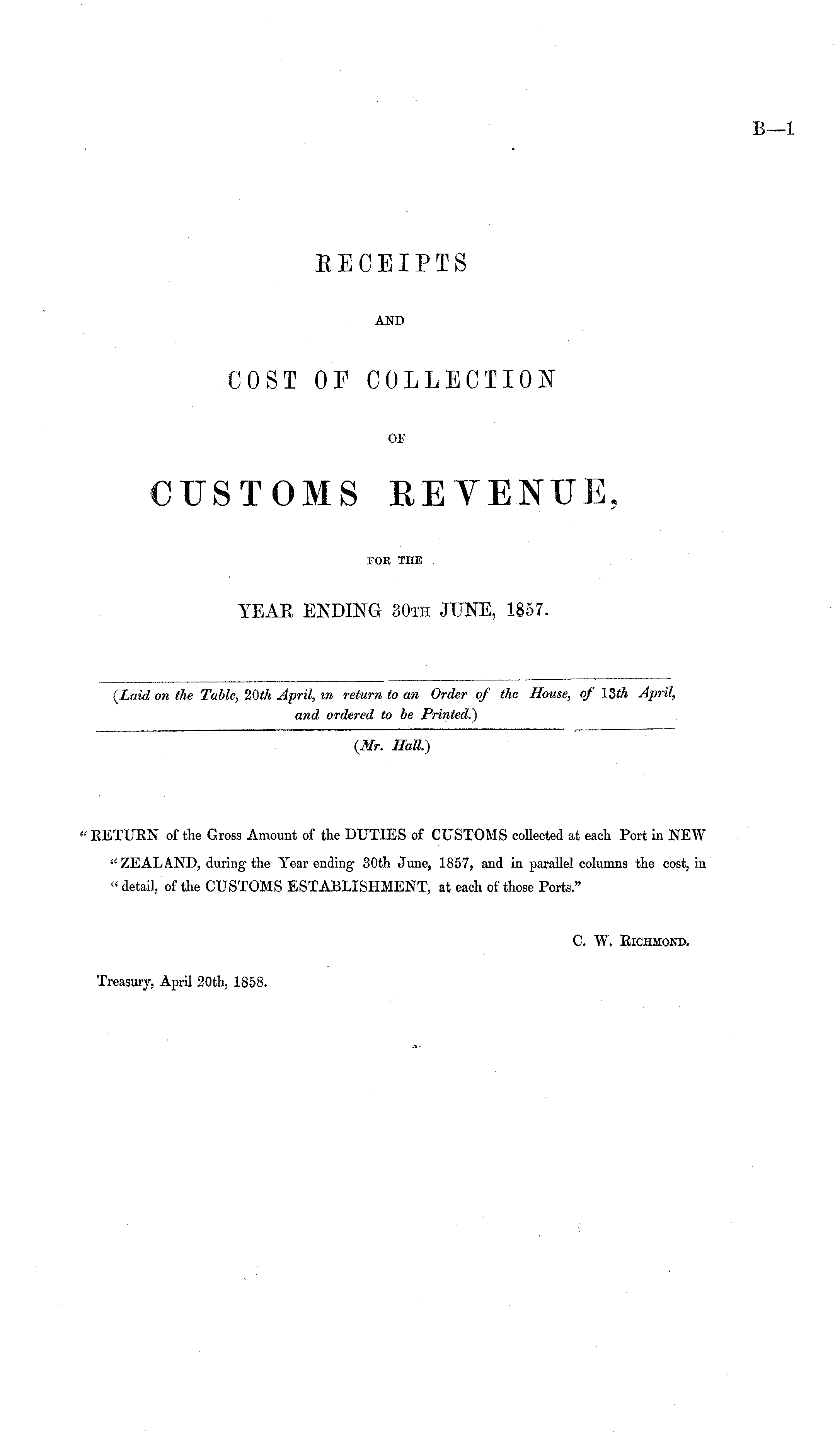 "RETURN of the Gross Amount of the DUTIES of CUSTOMS collected at each Port in NEW "ZEALAND, during the Year ending 30th June, 1857, and in parallel columns the cost, in "detail, of the CUSTOMS ESTABLISHMENT, at each of those Ports." C. W. Richmond. Treasury, April 20th, 1858.