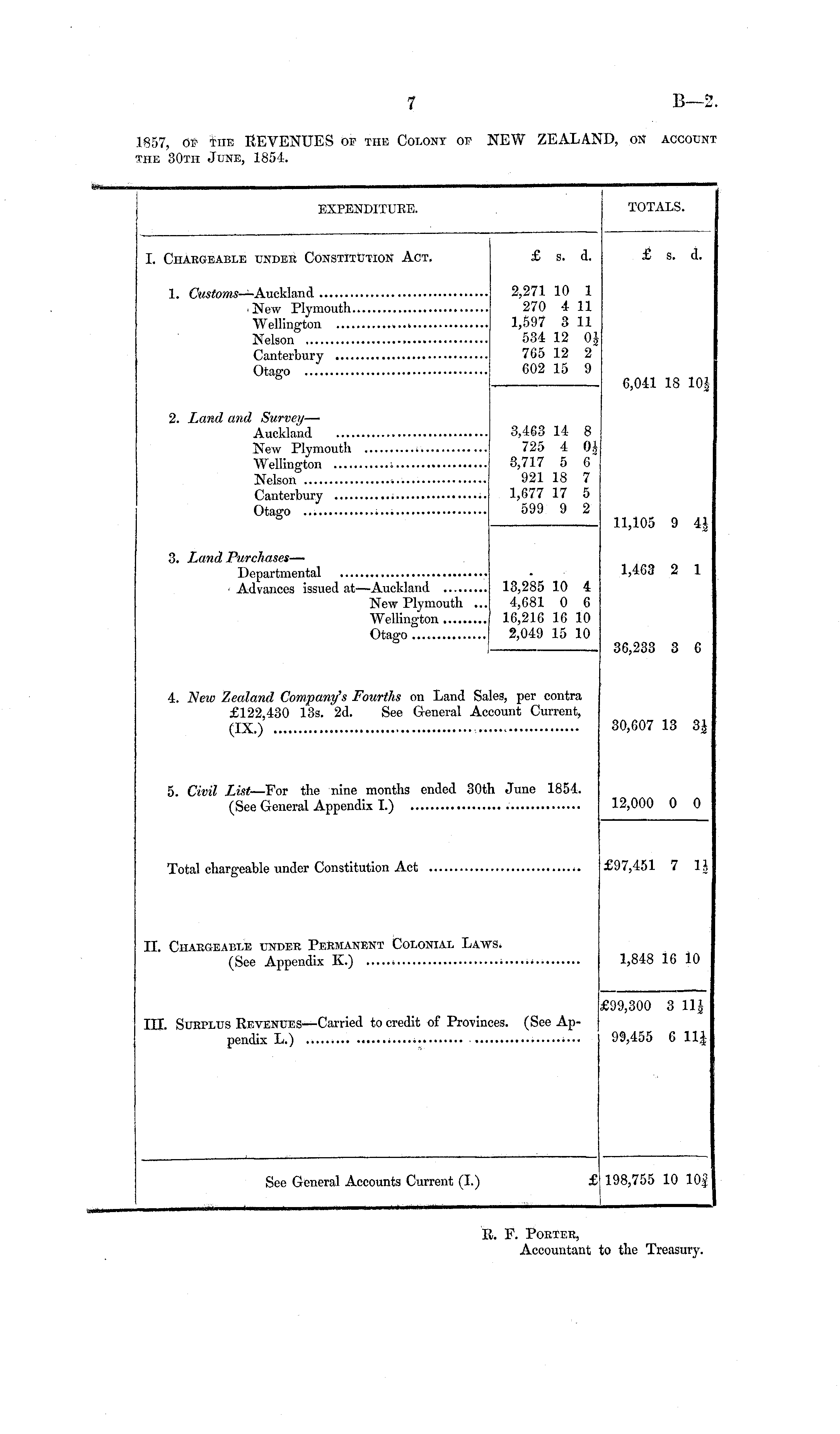 EXPENDITUKE. TOTALS. I. Chargeable under Constitution Act, £ s. i £ s. d. £ s. d. 1. Customs— Auckland 2,271 10 -New Plymouth 270 4 1 Wellington 1,597 3 1 Nelson 534 12 Canterbury 765 12 Otago 602 15 2,271 10 1 270 4 11 1,597 3 11 534 12 0J 765 12 2 602 15 9 6,041 18 10| 2. Land and Survey — Auckland 3,463 14 New Plymouth 725 4 Wellington 3,717 5 Nelson 921 18 Canterbury 1,677 17 . Otago 599 9 : 3,463 14 725 4 3,717 5 921 18 1,677 17 599 9 8 Oj 6 7 5 2 11,105 9 4J 3. Land Purchases — Departmental • Advances issued at—Auckland 13,285 10 New Plymouth ... 4,681 0 Wellington 16,216 16 1 Otago.... 2,049 15 1 13,285 10 4 4,681 0 6 16,216 16 10 2,049 15 10 1,463 2 1 36,233 3 6 4. New Zealand Company's Fourths on Land Sales, per contra £122,430 13s. 2d. See General Account Current, (IX.) 30,607 13 3J 5. Civil List —For the nine months ended 30th June 1854. (See General Appendix I.) 12,000 0 0 Total chargeable under Constitution Act £97,451 7 1J II. Chargeable under Permanent Colonial Laws. (See Appendix K.) • < 1,848 16 10 III. Surplus Revenues —Carried to credit of Provinces. (See Appendix L.) ;..... ;... £99,300 3 Hi 99,455 G Hi See General Accounts Current (I.) 198,755 10 10|