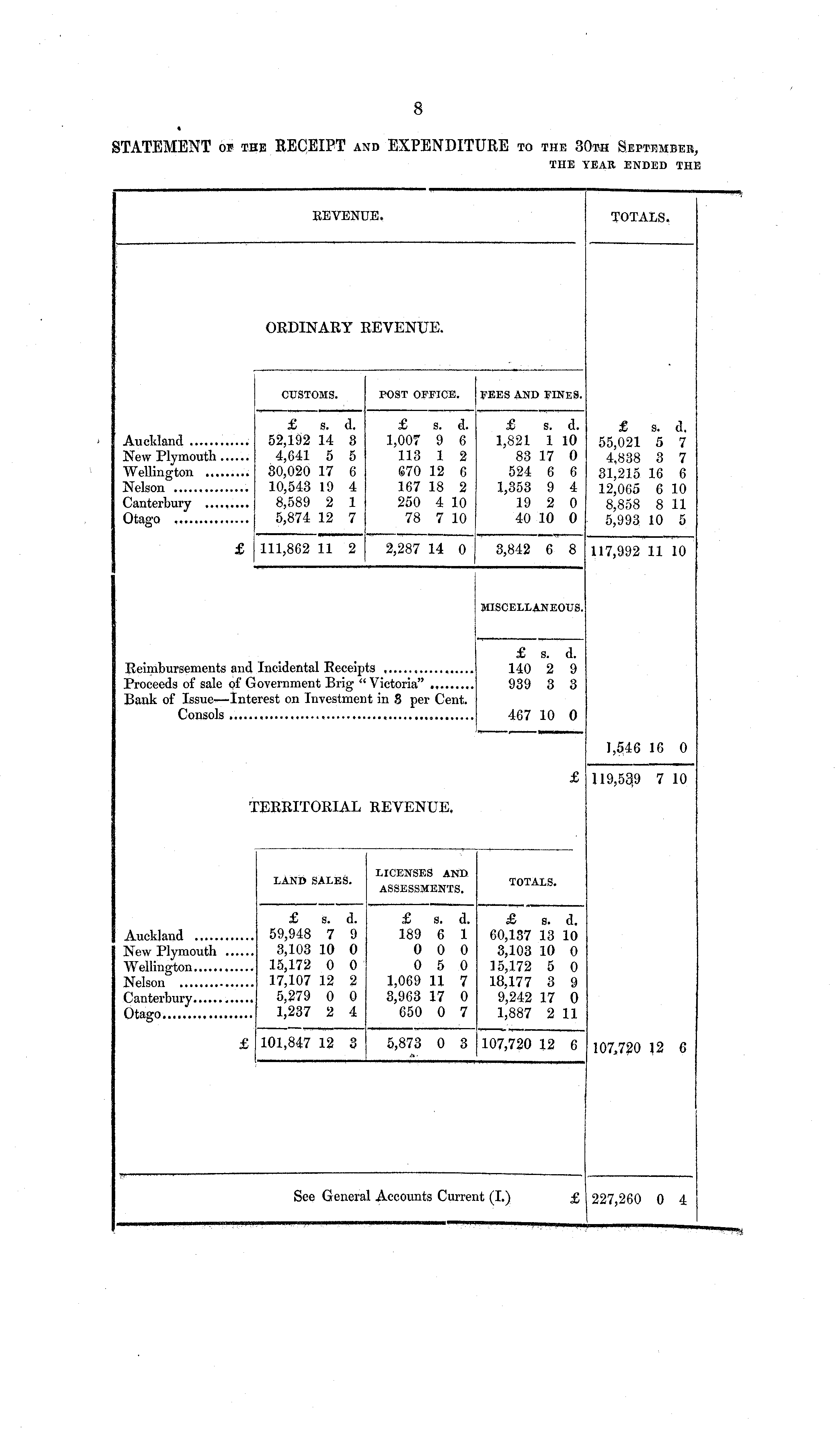 REVENUE. TOTALS. ORDINARY REVENUE. CUSTOMS. POST OFFICE. FEES AND FINES. Auckland New Plymouth Wellington Nelson Canterbury Otago £ s. 52,192 14 4,641 5 30,020 17 10,543 19 8,589 2 5,874 12 d. 3 5 6 4 1 7 £ s. d. 1,007 9 6 113 1 2 S70 12 6 167 18 2 250 4 10 78 7 10 £ s. d. 1,821 1 10 83 17 0 524 6 6 1,353 9 4 19 2 0 40 10 0 £ S. d. 55,021 5 7 4,838 3 7 31,215 16 6 12,065 6 10 8,858 8 11 5,993 10 5 111,862 11 2 2,287 14 0 3,842 6 8 117,992 11 10 MISCELLANEOUS. Reimbursements and Incidental Receipts Proceeds of sale of Government Brig "Victoria" ., Bank of Issue—Interest on Investment in 8 per Cent. Consols £ s. d. 140 2 9 939 3 3 467 10 0 1,5,46 16 0 £ 119,53,9 7 10 TERRITORIAL REVENUE, LICENSES AND LAND SALES. TOTALS. ASSESSMENTS. Auckland New Plymouth Wellington Nelson Canterbury Otago £ S. d. 59,948 7 9 3,103 10 0 15,172 0 0 17,107 12 2 5,279 0 0 1,237 2 4 £ s. 189 6 0 0 0 5 1,069 11 3,963 17 650 0 d. 1 0 0 7 0 7 £ s. d. 60,187 13 10 3,103 10 0 15,172 5 0 18,177 3 9 9,242 17 0 1,887 2 11 £ 101,847 12 3 5,873 0 3 107,720 12 6 107,720 ]2 6 See General Accounts Current (I.) 227,260 0 4-