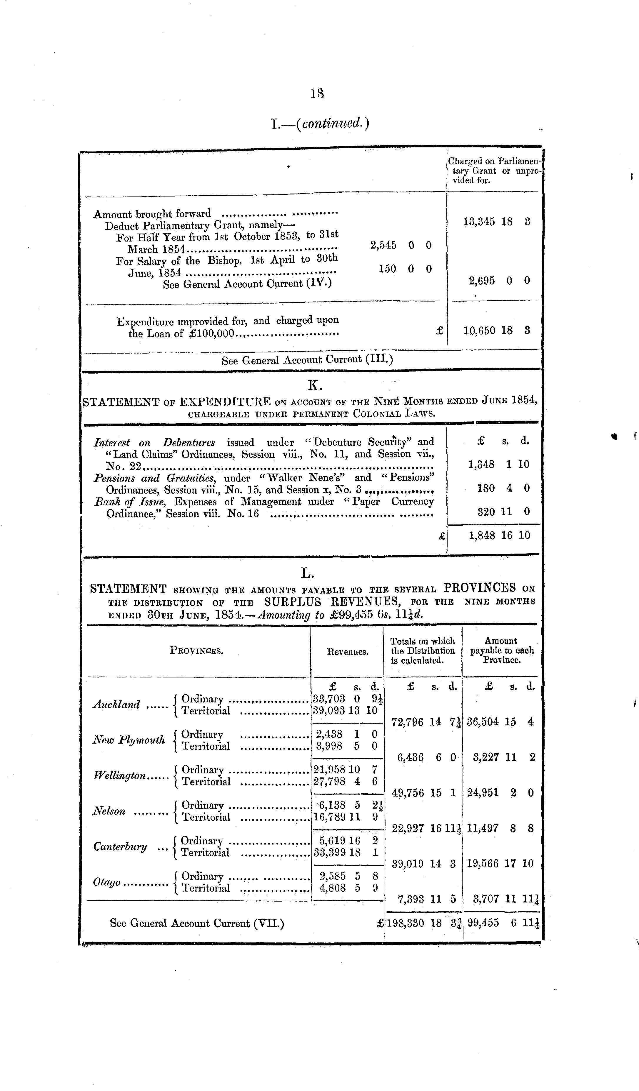 PROVINCES. llevenues. Totals on which the Distribution is calculated. Amount payable to each Province. £ s. d. 33,703 0 9J 39,093 13 10 £ s. d. £ s. d. Auckland | Ordinary ( lerritonal 72,796 14 7J 36,504 15 4 jSi:::;:::::::::::::: 2,438 3,998 1 5 0 0 6,436. 6 0 3,227 11 2 **** {?eSSf:::::::::::::::::: 21,958 10 27,798 4 7 6 49,756 15 1 24,951 2 0 ST , f Ordinary Nelson { rn ., •" , [ lerritorial 6,138 5 16,789 11 2J 9 11,497 8 8 22,927 16 11|; r, . , (Ordinary Canterbury ... | 5,619 16 33,399 18 2 1 19,566 17 10 39,019 14 3 f,. (Ordinary Ota 9° {Territorial 2,585 5 4,808 5 8 9 7,393 11 5 3,707 11 11| See General Account Current (VII.) 198,330 18 3f t 99,455 6 114