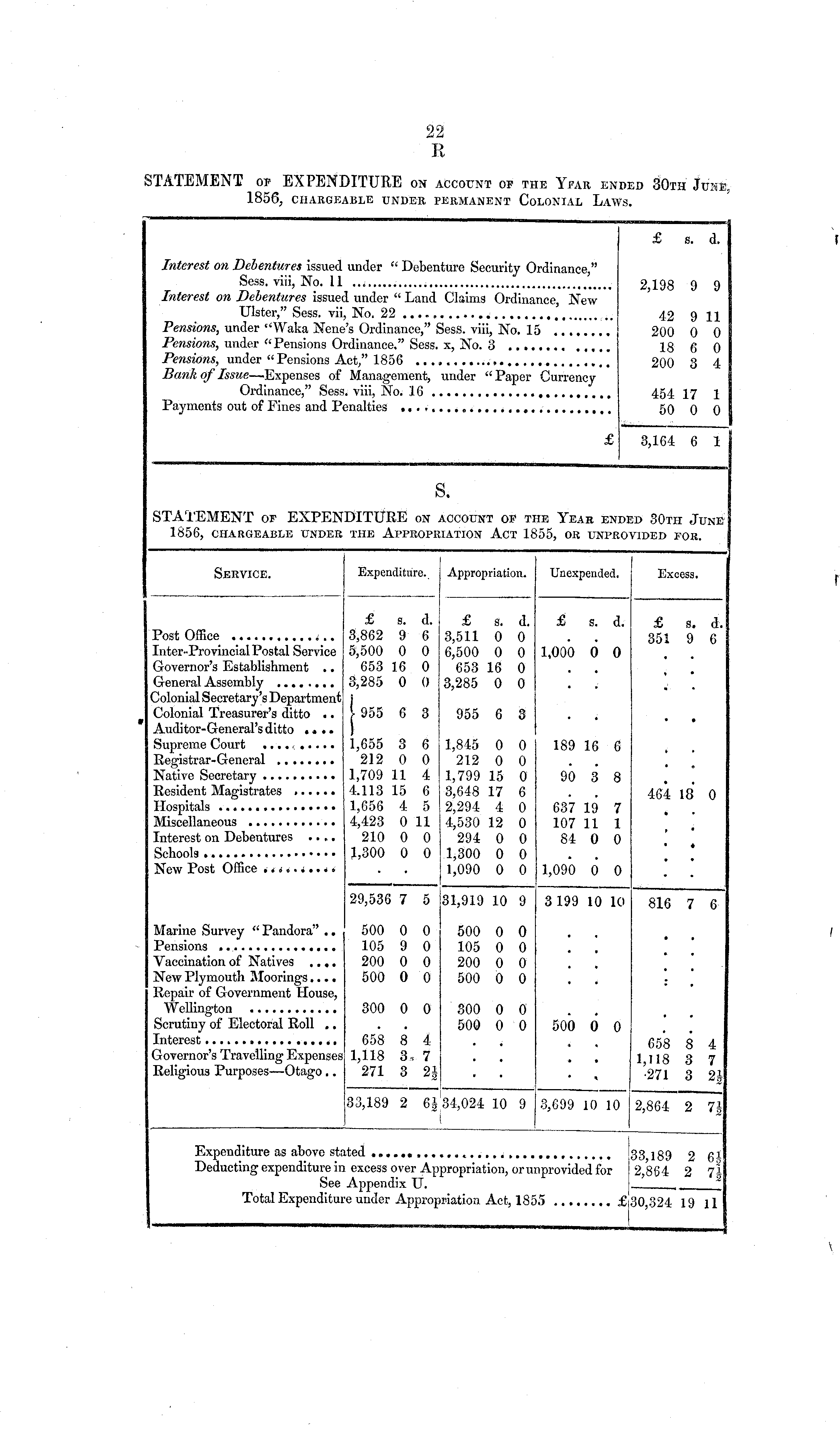 Service. Expenditure. Appropriation. Unexpended. Excess. £ s. d. 3,862 9 6 5,500 0 0 653 16 0 3,285 0 0 1 955 6 3 1.655 3 6 212 0 0 1,709 11 4 4.113 15 6 1.656 4 5 4,423 0 11 210 0 0 J,300 0 0 £ s. 3,511 0 6,500 0 653 16 3,285 0 d. 0 0 0 0 £ s. d. £ s. 351 9 d. 6 Post Office Inter-Provincial Postal Service Governor's Establishment .. General Assembly Colonial Secretary's Department Colonial Treasurer's ditto .. Auditor-General's ditto . •.. Supreme Court .... Registrar-General Native Secretary Resident Magistrates Hospitals Miscellaneous Interest on Debentures .... Schools •• New Post Office <.. * i 955 6 1,845 0 212 0 1,799 15 3,648 17 2,294 4 4,530 12 294 0 1,300 0 1,090 0 3 0 0 0 6 0 0 0 0 0 1,000 6 189 16 90 3 0 6 8 • • 637 19 107 11 84 0 7 1 0 464 18 0 • * • * 1,090 6 0 Marine Survey " Pandora" .. Pensions Vaccination of Natives .... New Plymouth Moorings.... Repair of Government House, Wellington Scrutiny of Electoral Roll .. Interest Governor's Travelling Expenses Religious Purposes—Otago .. 29,536 7 5 31,919 10 9 3199 10 10 816 7 6 500 0 0 105 9 0 200 0 0 500 0 0 500 0 0 105 0 0 200 0 0 500 0 0 • 300 0 0 300 0 0 500 0 0 500 6 0 658 8 4 1,118 3 7 271 3 21 658 1,118 •271 8 3 3 4 7 2 i ■• • • \ 33,189 2 H 34,024 10 9 3,699 10 10 2,864 2 71 Expenditure as above sts Deducting expenditure in See Total Expenditui lted • 33,189 2 6| i excess over Appropriation, or unprovided for 2,864 2 71 Appendix U. , f •e under Appropriation Act, 1855 £30,324 19 ll