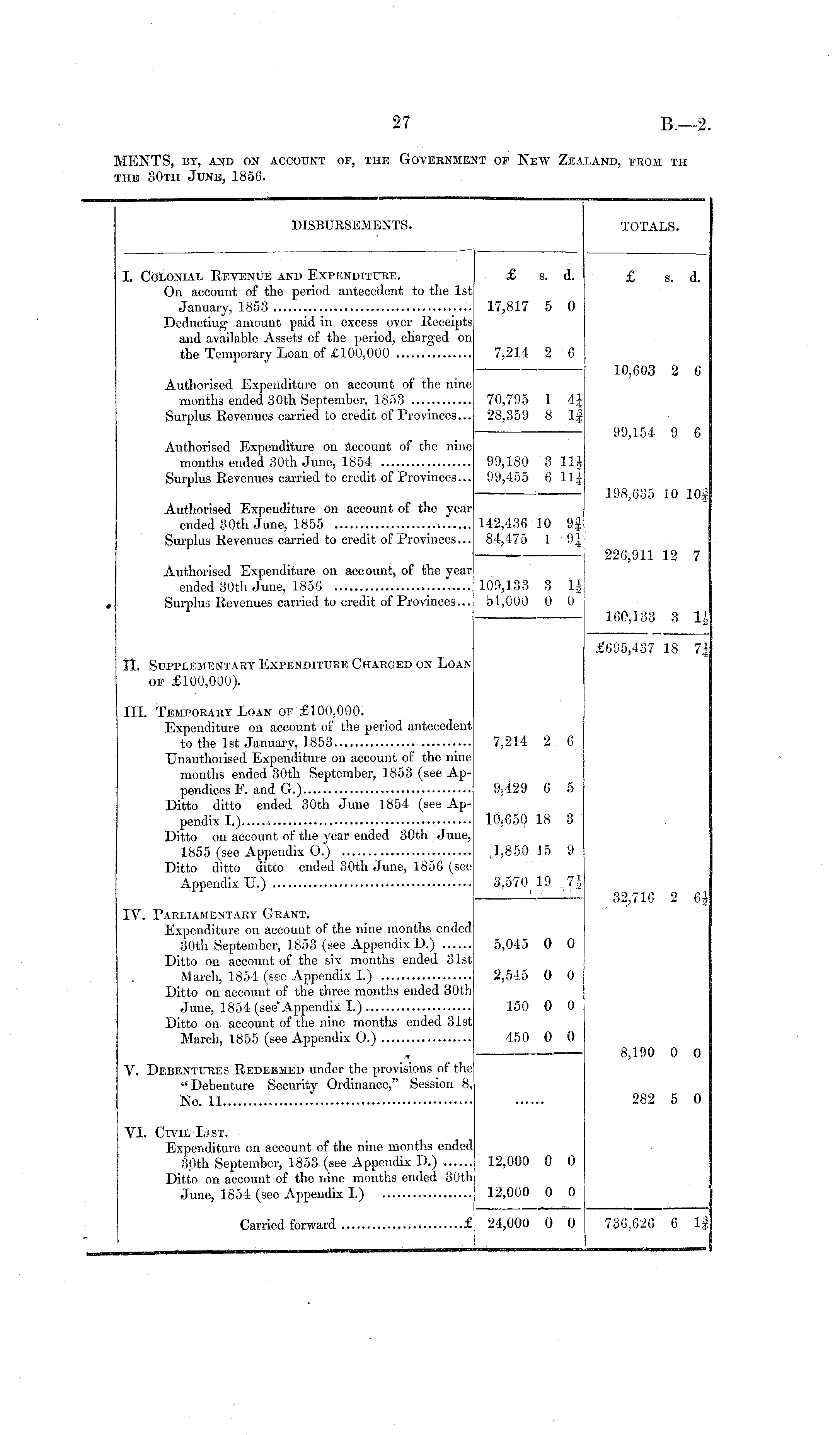 DISBURSEMENTS. TOTALS. I. Colonial Revenue and Expenditure. On account of the period antecedent to the 1st January, 1858 Deductiug amount paid in excess over Receipts and available Assets of the period, charged on the Temporary Loan of £100,000 £ 17,817 s. 5 d. 0 £ s. d. 7,214 2 6 10,003 2 6 Authorised Expenditure on account of the nine months ended 3 Oth September, 1853 Surplus Revenues carried to credit of Provinces... 70,795 28,359 1 8 13 Authorised Expenditure on account of the nine months ended 30th June, 1854 Surplus Revenues carried to credit of Provinces... 99,154 9 6 I 99,180 99,455 3 11J 6 11.1 198,035 10 10| Authorised Expenditure on account of the year ended 30th June, 1855 Surplus Revenues carried to credit of Provinces... 142,436 10 84,475 1 9if n Authorised Expenditure on account, of the year ended 30th June, 1856 Surplus Revenues carried to credit of Provinces... 220,911 12 7 109,133 51,000 3 0 H 0 160,133 3 lj il. Supplementary Expenditure Charged on Loan op £100,000). £605,437 18 7 j III. Temporary Loan of £100,000. Expenditure on account of the period antecedent to the 1st January, 1853 Unauthorised Expenditure on account of the nine months ended 30th September, 1853 (see Appendices F. and G-.) Ditto ditto ended 30th June 1854 (see Appendix I.) Ditto on account of the year ended 30th June, 1855 (see Appendix O.) Ditto ditto ditto ended 30th June, 1856 (see Appendix IT.) 7,214 2 6 9 ; 429 6 5 32,710 2 6J 10j650 18 3 ,1,850 15 9 3,57019 .7J IV. Parliamentary Grant. Expenditure on account of the nine months ended 30th September, 1853 (see Appendix D.) Ditto on account of the six months ended 31st March, 1854 (see Appendix I.) Ditto on account of the three months ended 30th June, 1854 (see* Appendix I.) Ditto on account of the nine months ended 31st March, 1855 (see Appendix O.) 5,045 2,545 0 0 0 0 150 450 0 0 0 0 8,190 0 0 V. Debentures Redeemed under the provisions of the "Debenture Security Ordinance," Session 8, No. 11 • 282 5 0 VI. Civil List. Expenditure on account of the nine months ended 30th September, 1853 (see Appendix D.) Ditto on account of the nine months ended 30th June, 1854 (see Appendix I.) 12,000 ( 0 0 12,000 i 0 0 Carried forward * £ 24,000 0 t> 730,626 6 If