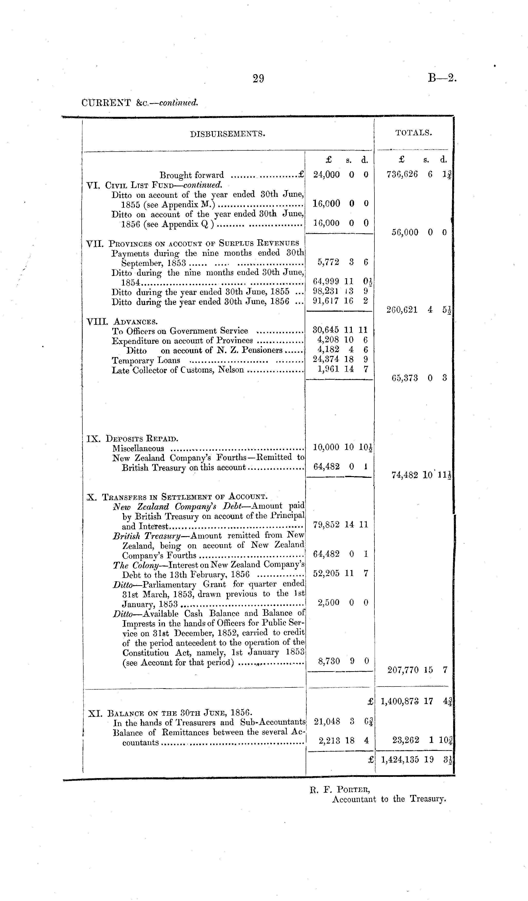 DISBURSEMENTS. TOTALS. £ s. d. £ s. d. Brought forward £ VI, Civil Ltst Fund— continued. Ditto on account of the year ended 30th June, 1855 (see Appendix M.) Ditto on account of the year ended 30th June, 1856 (see Appendix Q ) 24,000 0 0 736,626 6 If 16,000 0 0 VII. Provinces on account of Surplus Revenues Payments during the nine months ended 30th September, 1853 •- Ditto during the nine months ended 30th June, 1854 Ditto during the year ended 30th June, 1855 ... Ditto during the year ended 30th June, 1856 ... 16,000 0 0 56,000 0 0 5,772 3 6 64,999 11 98,231 13 91,617 16 01 9 2 200,621 4 5| VIII. Advances. To Officers on Government Service Expenditure on account of Provinces Ditto on account of N. Z. Pensioners Temporary Loans Late Collector of Customs, Nelson 30,645 11 11 4,208 10 6 4,182 4 6 24,374 18 9 1,961 14 7 05,373 0 3 IX. Deposits Repaid. M iscellaneous «• New Zealand Company's Fourths — Remitted to British Treasury on this account 10,000 10 104 74,482 10'HA 64,482 0 1 X. Transfers in Settlement op Account. New Zealand Company's Debt —Amount paid by British Treasury on account of the Principal and Interest British Treasury —Amount remitted from New Zealand, being on account of New Zealand Company's Fourths ; The Colony —Interest on New Zealand Company's Debt to the 13th February, 1856 Ditto —Parliamentary Grant for quarter ended 31st March, 1853, drawn previous to the 1st January, 1853 j Ditto —Available Cash Balance and Balance of Imprests in the hands of Officers for Public Service on 31st December, 1852, carried to credit of the period antecedent to the operation of the Constitutiou Act, namely, 1st January 1853 (see Account for that period) .--.. 79,852 14 11 64,482 0 1 52,205 11 7 2,500 0 0 8,730 9 0 207,770 15 7 £j 1,400,873 17 4| XL Balance on the 30th June, 1856. In the hands of Treasurers and Sub-AccountantSj Balance of Remittances between the several Accountants 21,048 3 H 23,262 1 10f 2,213 18 4 1,424,135 19 3|