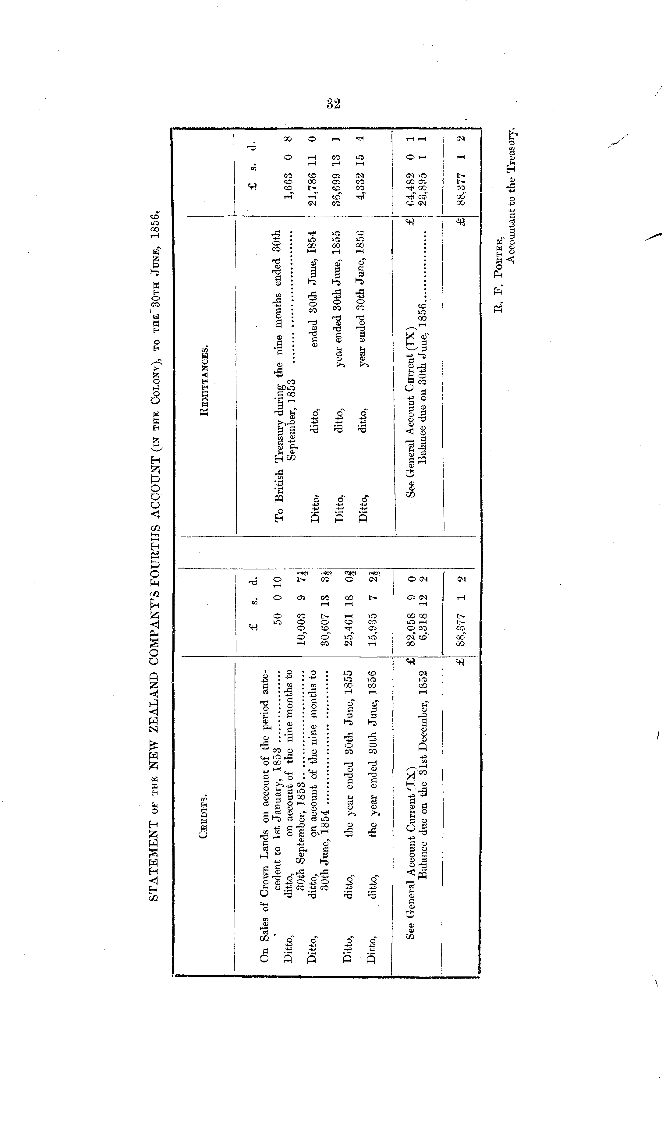 Credits. Remittances. £ s. d. £ s. d. On Sales of Crown Lands on account of the period antecedent to 1st January, 1853 Ditto, ditto, on account of the nine months to 30th September, 1853 Ditto, ditto, on account of the nine months to 30th June, 1854 50 0 10 10,003 9 7£ To British Treasury during the nine months ended 30th September, 1853 1,663 0 8 Ditto; ditto, ended 30th June, 1854 21,786 11 0 30,607 13 3| 36,699 13 1 Ditto, ditto, the year ended 30th June, 1855 25,461 18 0| Ditto, ditto, year ended 30th Juue, 1855 Ditto, ditto, year ended 30th June, 1856 4,332 15 4 Ditto, ditto, the year ended 30th June, 1856 15,935 7 2i See General Account Current 'IX) £ Balance due on the 31st December, 1852 82,058 9 6,318 12 0 2 See General Account Current (IX) Balance due on 30th June, 1856 £ 64,482 23,895 0 1 1 1 88,377 1 2 88,377 1 2